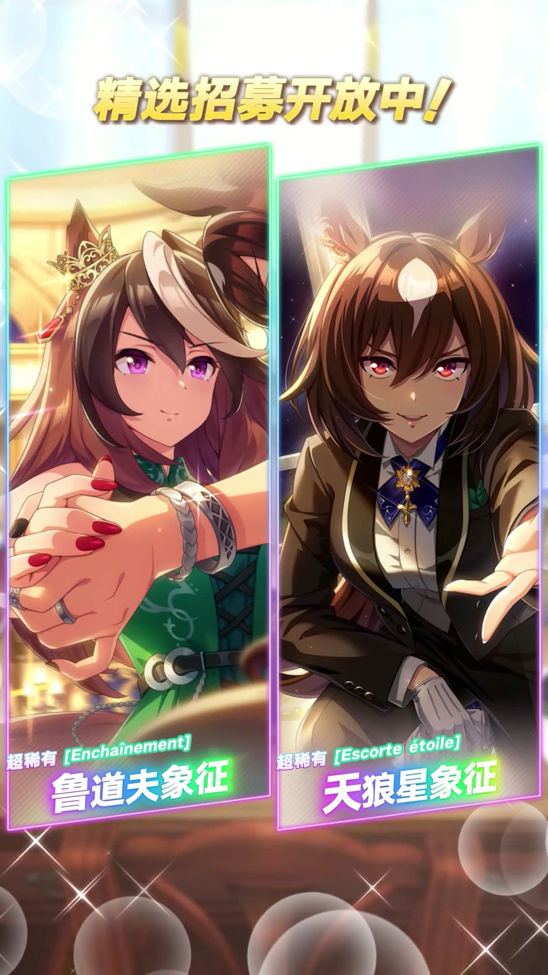 新的超稀有 [Enchaînement]鲁道夫象征、[Escorte étoile]天狼星象征 等协助卡登场! 本次招募中新登场的协助卡,在当前开放的剧情活动“今夜,起舞于最终直道”中可获得加成! ■新登场的协助卡 超稀有 [Enchaînement]鲁道夫象征(配音:田所梓) 超稀有 [Escorte étoile]天狼星象征(配音:菲鲁兹·蓝) 9月29日 12:00起,游戏内已开放“精选