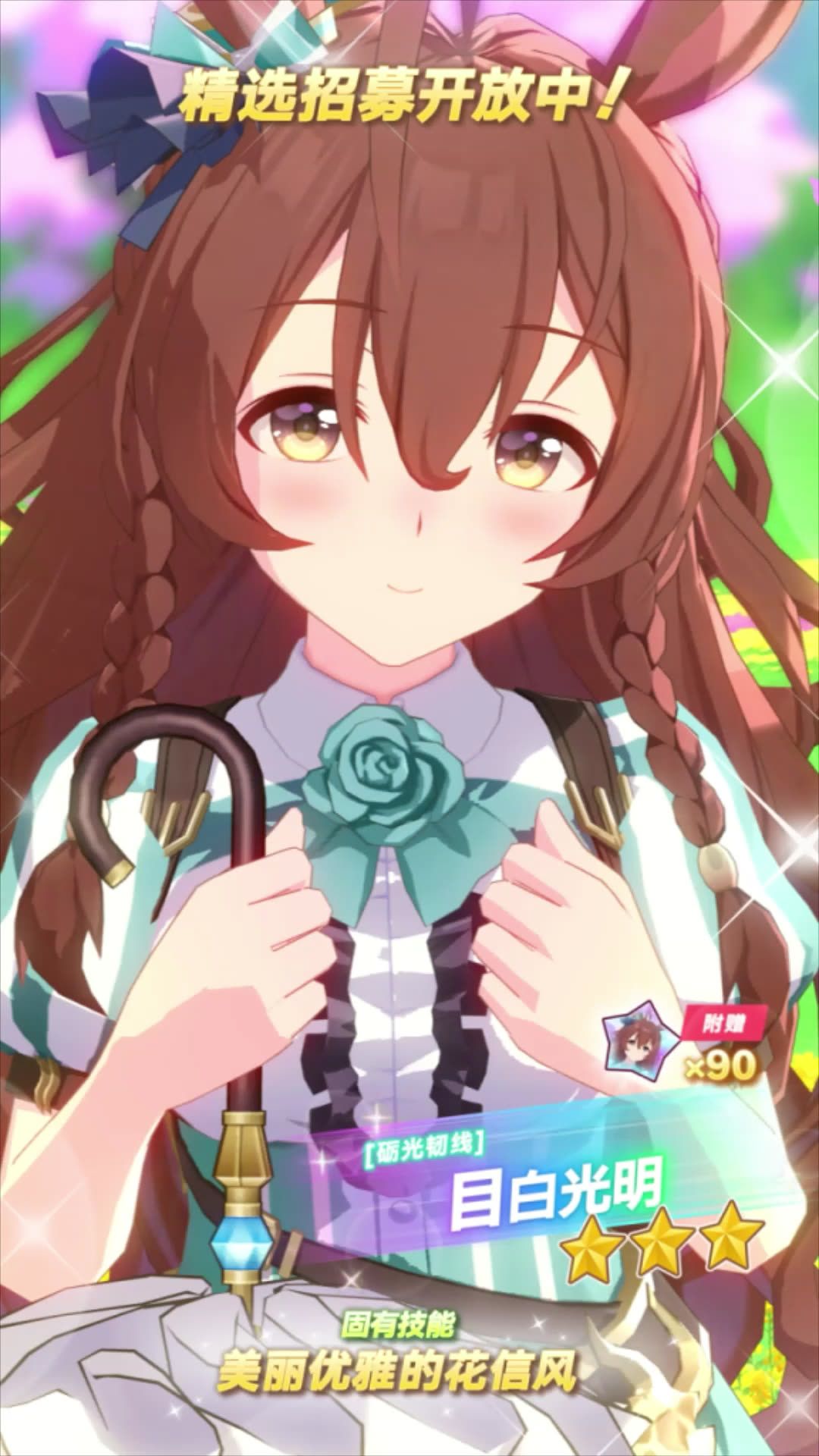 ✦[砺光韧线]目白光明 能力介绍✦ 距离适应性:中距离、长距离 跑法适应性:居中、后追 场地适应性:草地 固有技能:[美丽优雅的花信风] 9月27日 12:00起,游戏内已开放“精选 优俊少女招募”! 精选招募开放期间,抽取招募并获得上述养成优俊少女,将附赠“[砺光韧线]目白光明的碎片”×90,还请不要错过! 今后也请多多支持《闪耀!优俊少女》!