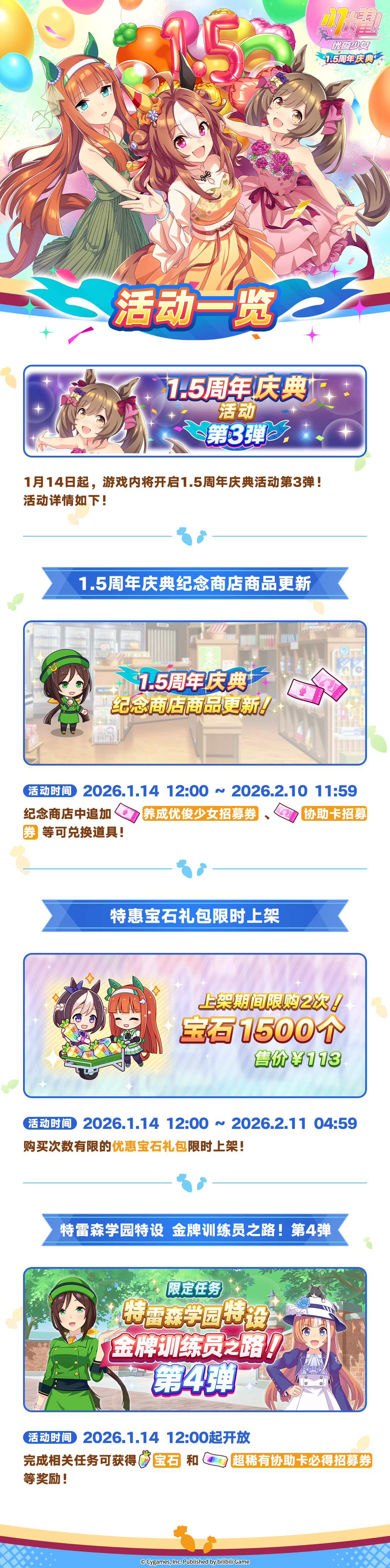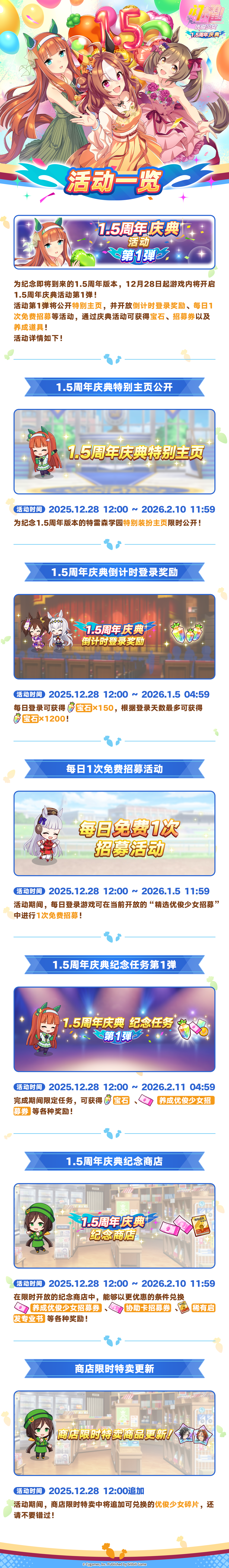 《闪耀!优俊少女》即将于1月5日迎来1.5周年版本纪念!为纪念1.5周年版本,游戏内将于12月28日起陆续举办"1.5周年庆典"系列活动!本次活动中,最多可进行“免费100连抽”,通过登录活动和宝石礼物还可获得最多“宝石×7200”,更有限时庆典活动等待训练员的参与!各活动概要请查看下方长图↓今后也请多多支持《闪耀!优俊少女》!