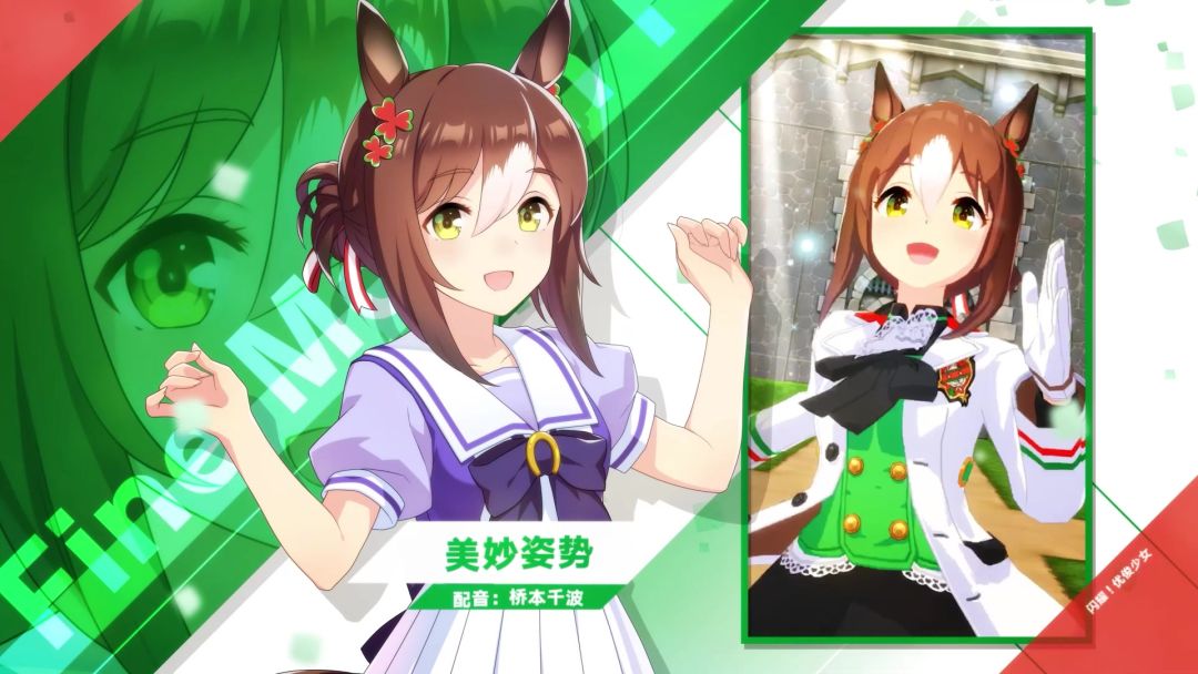 #闪耀优俊少女 全国的新人训练员们,来认识一下那些在特雷森学园和我们一起实现梦想的学生吧! 来自爱尔兰、出身名门的深闺大小姐优俊少女“美妙姿势”。她有着对感兴趣的事情会立刻动手尝试的纯粹性格,也因此有着让人放心不下的冒失一面。 配音:桥本千波