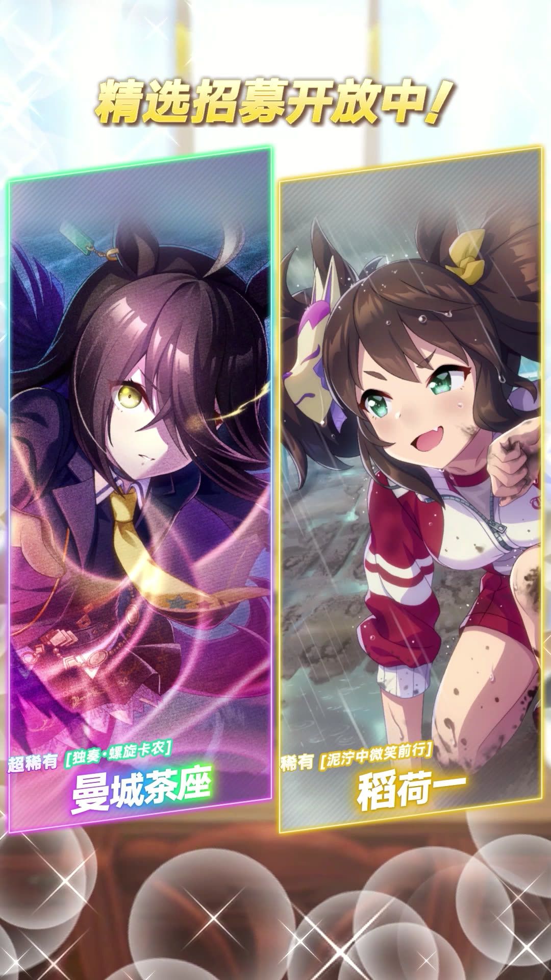 ■新登场的协助卡 超稀有 [独奏·螺旋卡农]曼城茶座(配音:小仓唯) 稀有 [泥泞中微笑前行]稻荷一(配音:井上遥乃) 普通 [特雷森学园]稻荷一(配音:井上遥乃) 7月17日 12:00起,游戏内已开放“精选 协助卡招募”,还请不要错过! 今后也请多多支持《闪耀!优俊少女》!