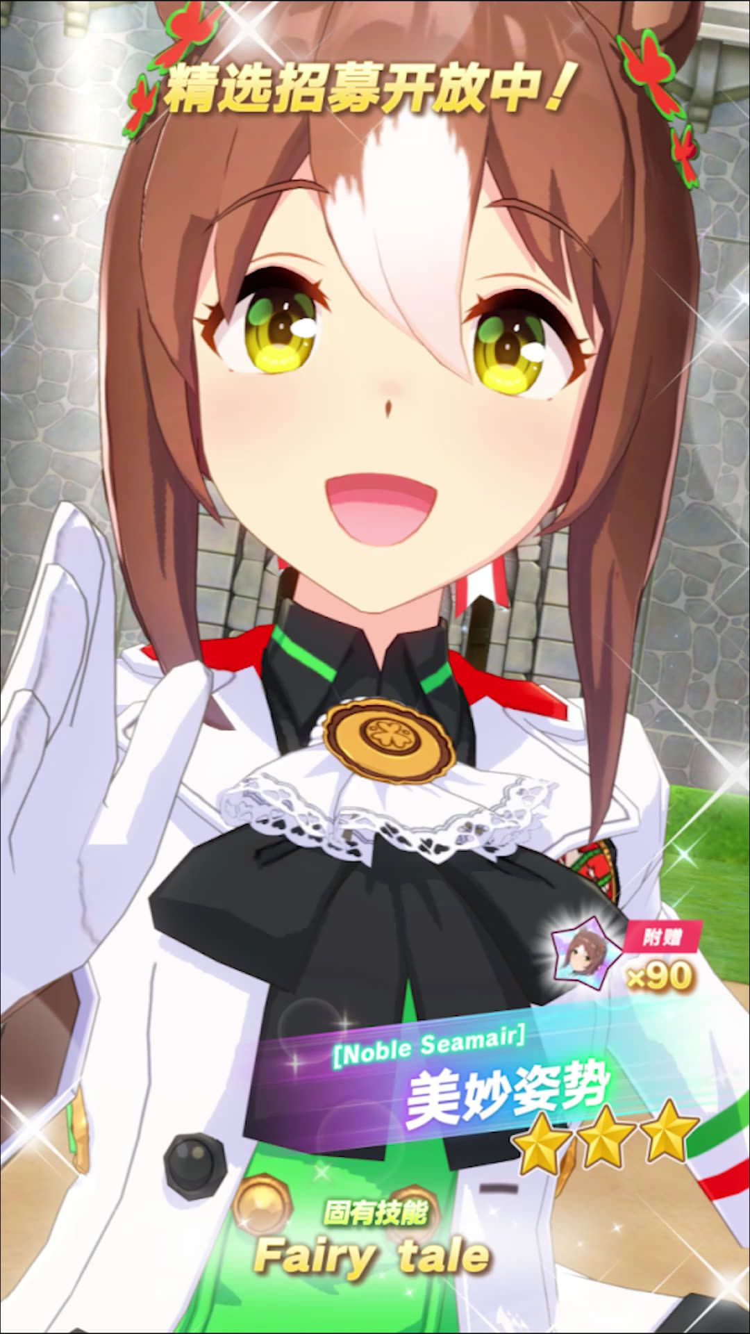 ✦[Noble Seamair]美妙姿势 能力介绍✦ 距离适应性:英里、中距离 跑法适应性:跟前 场地适应性:草地 固有技能:[Fairy tale] 7月17日 12:00起,游戏内已开放“精选 养成优俊少女招募”! 精选招募开放期间,抽取招募并获得上述养成优俊少女,将附赠“[Noble Seamair]美妙姿势的碎片”×90,还请不要错过! 今后也请多多支持《闪耀!优俊少女》!