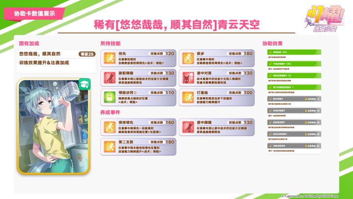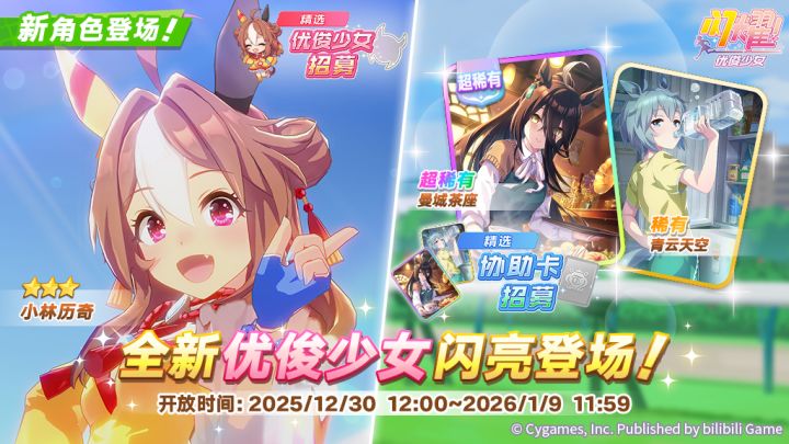 ■新登场的协助卡 超稀有 [It's on the house.]曼城茶座(配音:小仓唯) 稀有 [悠悠哉哉,顺其自然]青云天空(配音:鬼头明里) 12月30日 12:00起,游戏内已开放“精选 协助卡招募”,还请不要错过! 今后也请多多支持《闪耀!优俊少女》!