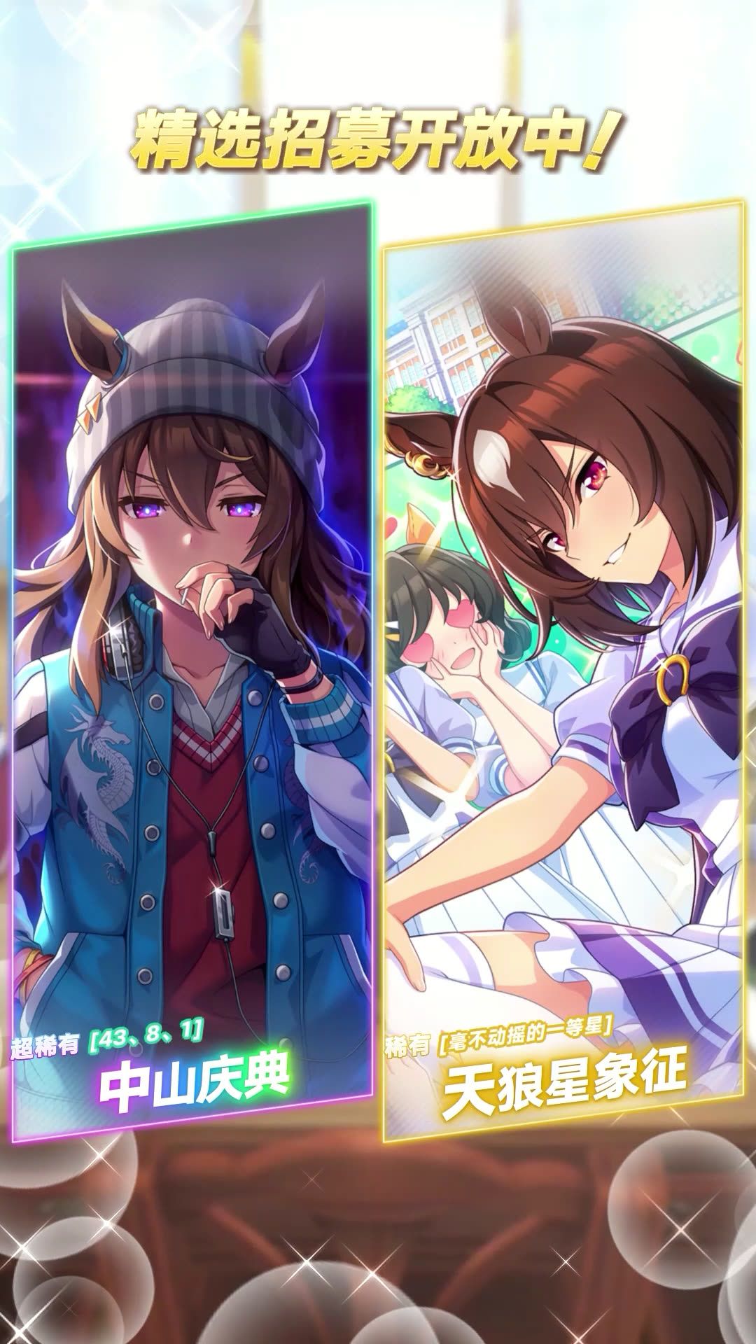 ■新登场的协助卡 超稀有 [43、8、1]中山庆典(配音:下地紫野) 稀有 [毫不动摇的一等星]天狼星象征(配音:菲鲁兹·蓝) 普通 [特雷森学园]中山庆典(配音:下地紫野) 普通 [特雷森学园]天狼星象征(配音:菲鲁兹·蓝) 6月18日 12:00起,游戏内已开放“精选 协助卡招募”,还请不要错过! 今后也请多多支持《闪耀!优俊少女》!