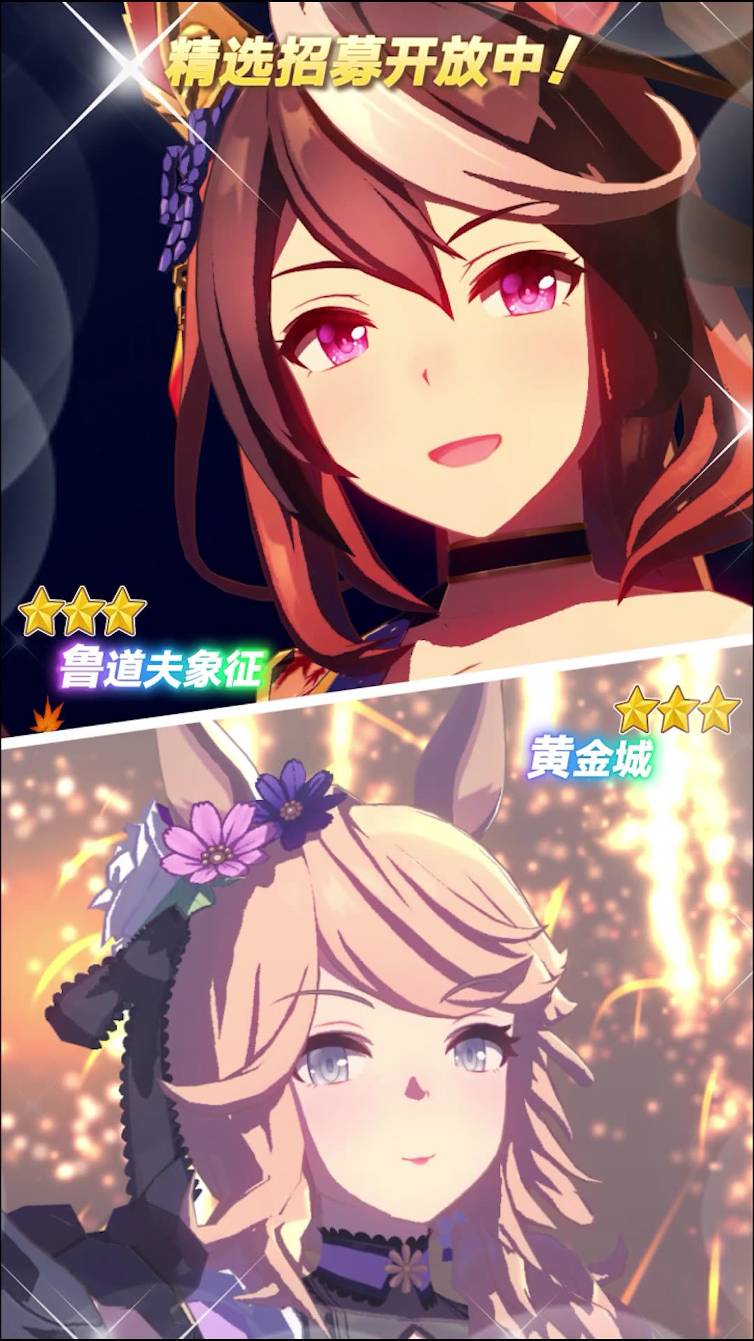 新的★★★养成优俊少女[皓月下的神箭手]鲁道夫象征(配音:田所梓)& [秋樱舞娘]黄金城(配音:香坂沙希)登场! 本次招募中新登场的养成优俊少女,在当前开放的剧情活动“晚秋骏典乐争鸣”中可获得加成! ✦[皓月下的神箭手]鲁道夫象征 能力介绍✦ 距离适应性:中距离、长距离 跑法适应性:跟前、居中 场地适应性:草地 固有技能:[拨云见月鸣镝箭] ✦[秋樱舞娘]黄金城 能力介绍✦ 距离适应性:英里 跑