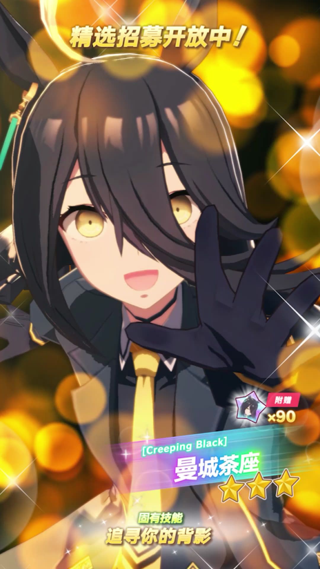 ✦[Creeping Black]曼城茶座 能力介绍✦ 距离适应性:长距离 跑法适应性:居中 场地适应性:草地 固有技能:[追寻你的背影] 6月18日 12:00起,游戏内已开放“精选 养成优俊少女招募”! 精选招募开放期间,抽取招募并获得上述养成优俊少女,将附赠“[Creeping Black]曼城茶座的碎片”×90,还请不要错过! 今后也请多多支持《闪耀!优俊少女》!