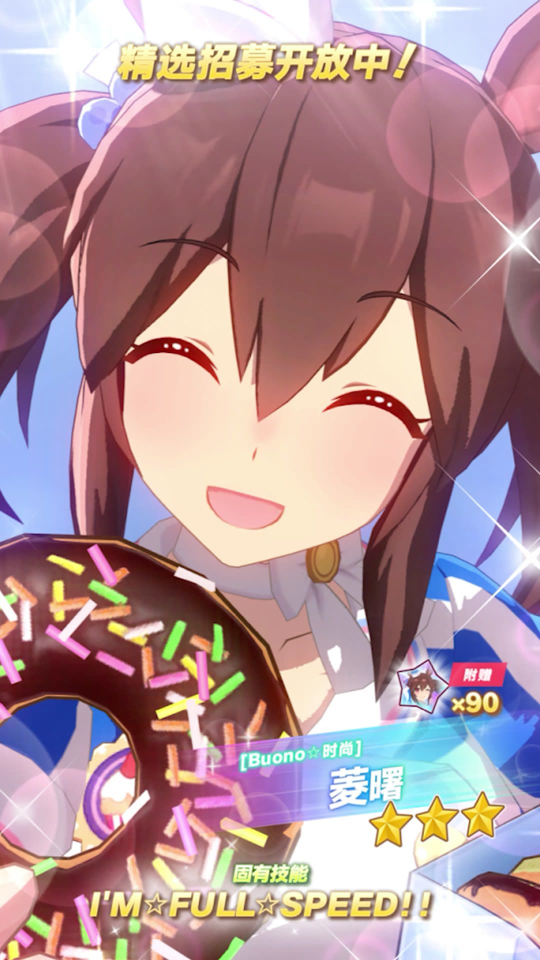 ✦[Buono☆时尚]菱曙 能力介绍✦ 距离适应性:短距离 跑法适应性:跟前 场地适应性:草地 固有技能:[I'M☆FULL☆SPEED!!] 5月26日 12:00起,游戏内已开放“精选 优俊少女招募”! 精选招募开放期间,抽取招募并获得上述养成优俊少女,将附赠“[Buono☆时尚]菱曙的碎片”×90,还请不要错过! 今后也请多多支持《闪耀!优俊少女》!