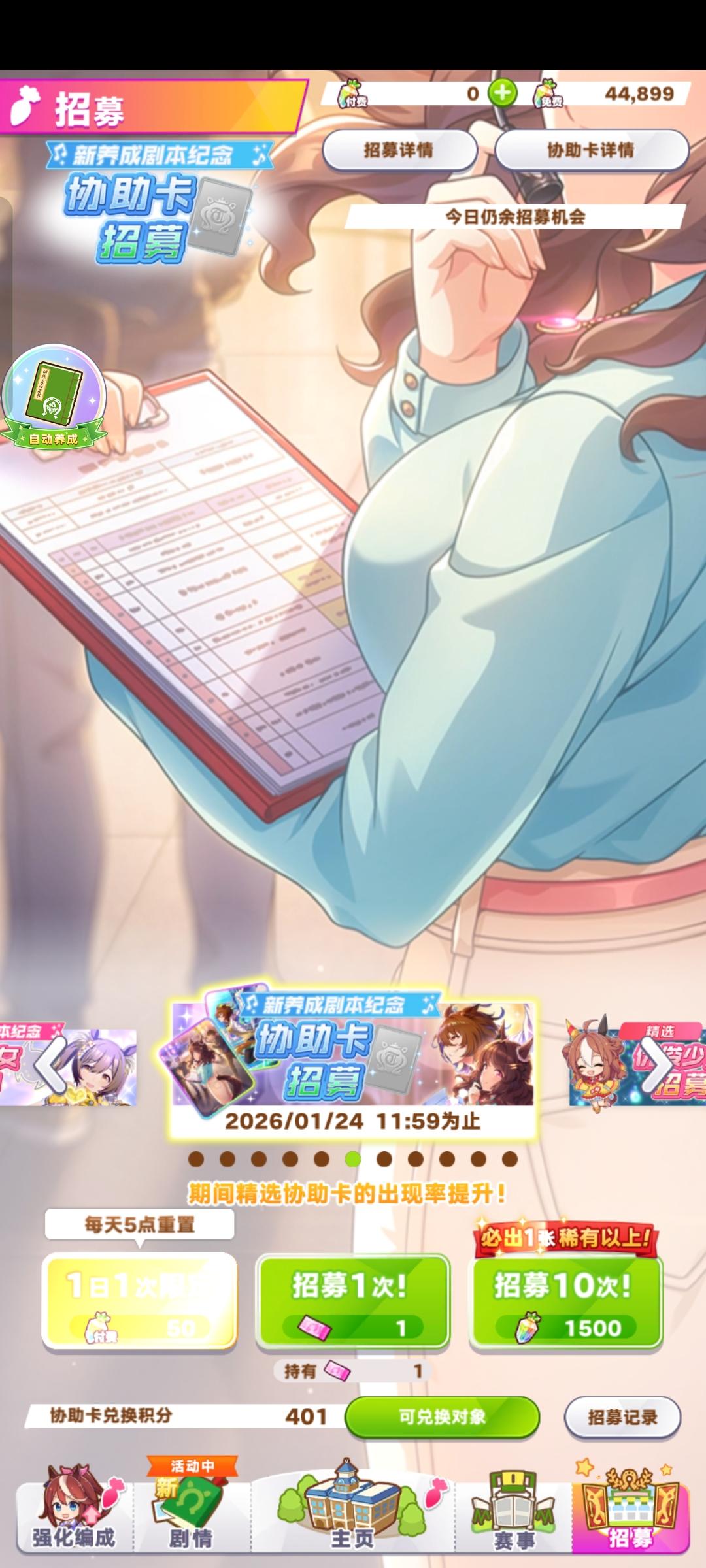 ■新登场的协助卡 超稀有 [from the GROUND UP]明亮光晕(配音:植田佳奈) 超稀有 [Q≠0]爱丽速子(配音:上坂堇) 普通 [活动制作人]明亮光晕(配音:植田佳奈) 1月5日 维护后,游戏内已开放“精选 协助卡招募”,还请不要错过! 今后也请多多支持《闪耀!优俊少女》!