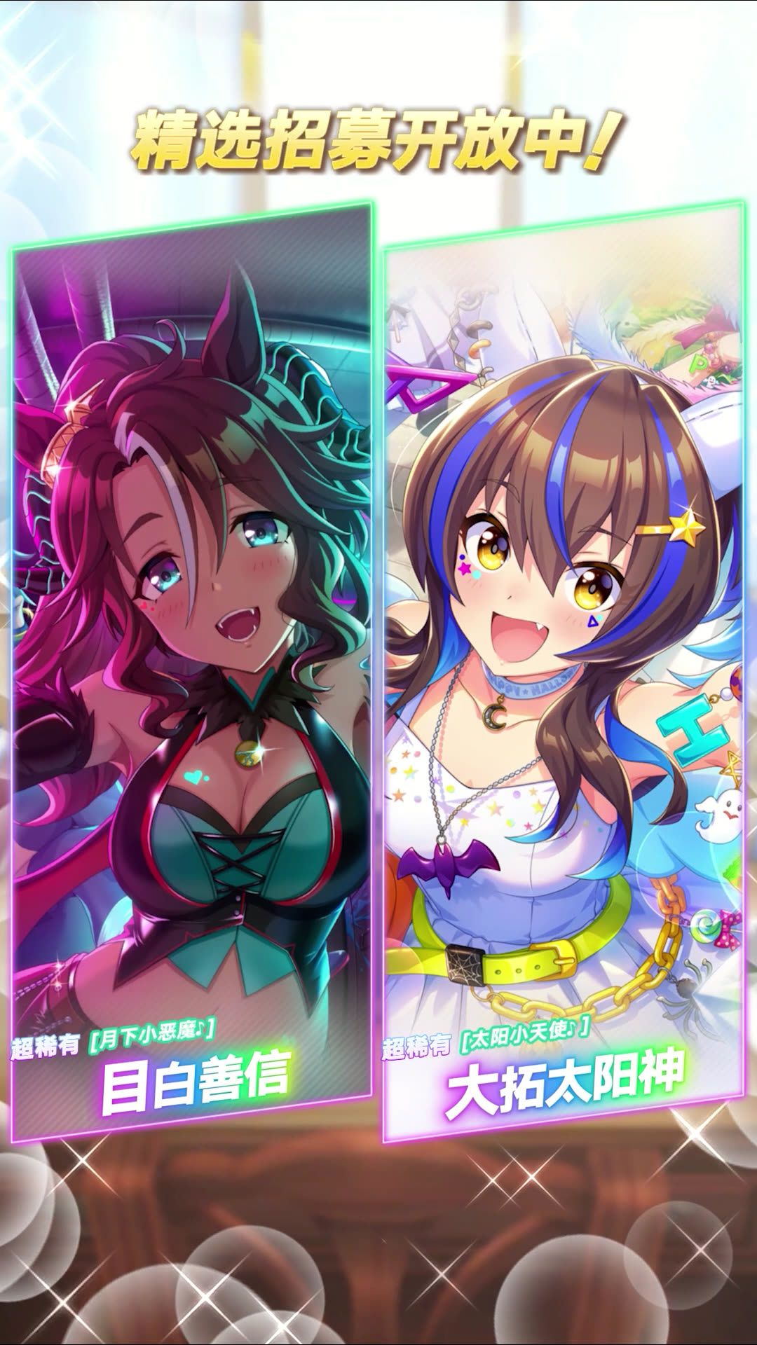 本次招募中新登场的协助卡,在当前开放的剧情活动“转瞬即逝的日子”中可获得加成! ■新登场的协助卡 超稀有 [月下小恶魔♪]目白善信(配音:野口百合) 超稀有 [太阳小天使♪]大拓太阳神(配音:山根绮) 1月28日 12:00起,游戏内已开放“精选 协助卡招募”,还请不要错过! 今后也请多多支持《闪耀!优俊少女》!