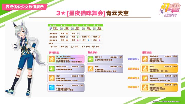 ✦[砺光韧线]目白光明 能力介绍✦ 距离适应性:中距离、长距离 跑法适应性:居中、后追 场地适应性:草地 固有技能:[美丽优雅的花信风] 9月27日 12:00起,游戏内已开放“精选 优俊少女招募”! 精选招募开放期间,抽取招募并获得上述养成优俊少女,将附赠“[砺光韧线]目白光明的碎片”×90,还请不要错过! 今后也请多多支持《闪耀!优俊少女》!