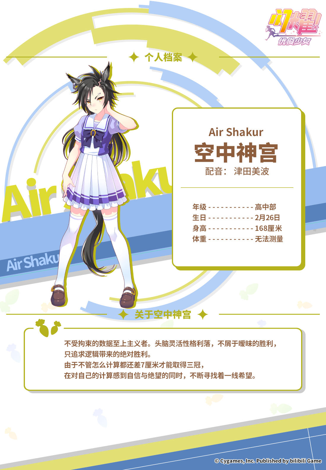 全国的新人训练员们,来认识一下那些在特雷森学园和我们一起实现梦想的学生吧! 不受拘束的数据至上主义者“空中神宫”。头脑灵活性格利落,不追求随意的胜利,只追求由逻辑带来的绝对胜利。 配音:津田美波