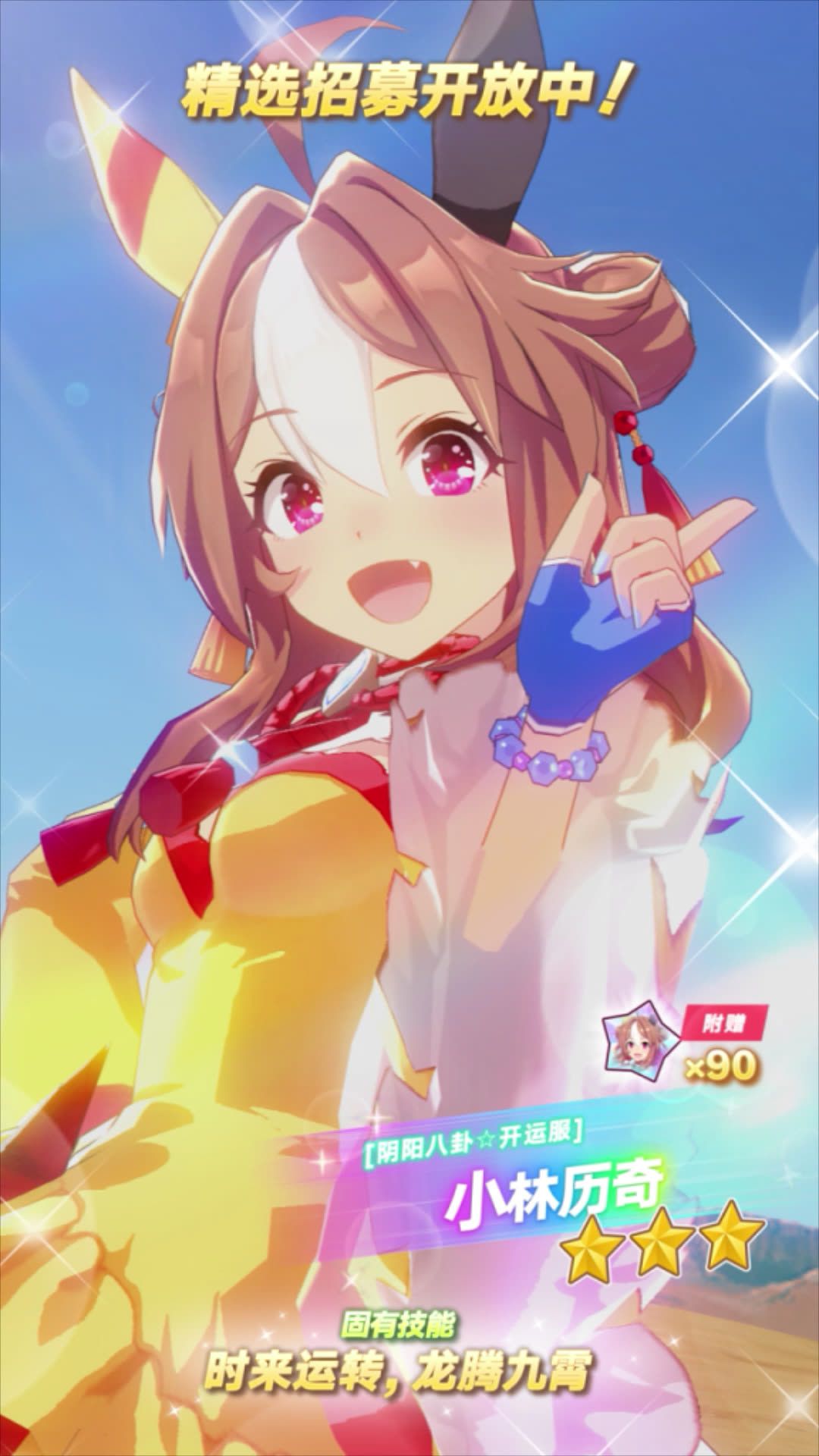 ✦[阴阳八卦☆开运服]小林历奇 能力介绍✦ 距离适应性:英里、中距离 跑法适应性:领跑、跟前 场地适应性:泥地 固有技能:[时来运转,龙腾九霄] 12月30日 12:00起,游戏内已开放“精选 优俊少女招募”! 精选招募开放期间,抽取招募并获得上述养成优俊少女,将附赠“[阴阳八卦☆开运服]小林历奇的碎片”×90,还请不要错过! 今后也请多多支持《闪耀!优俊少女》!