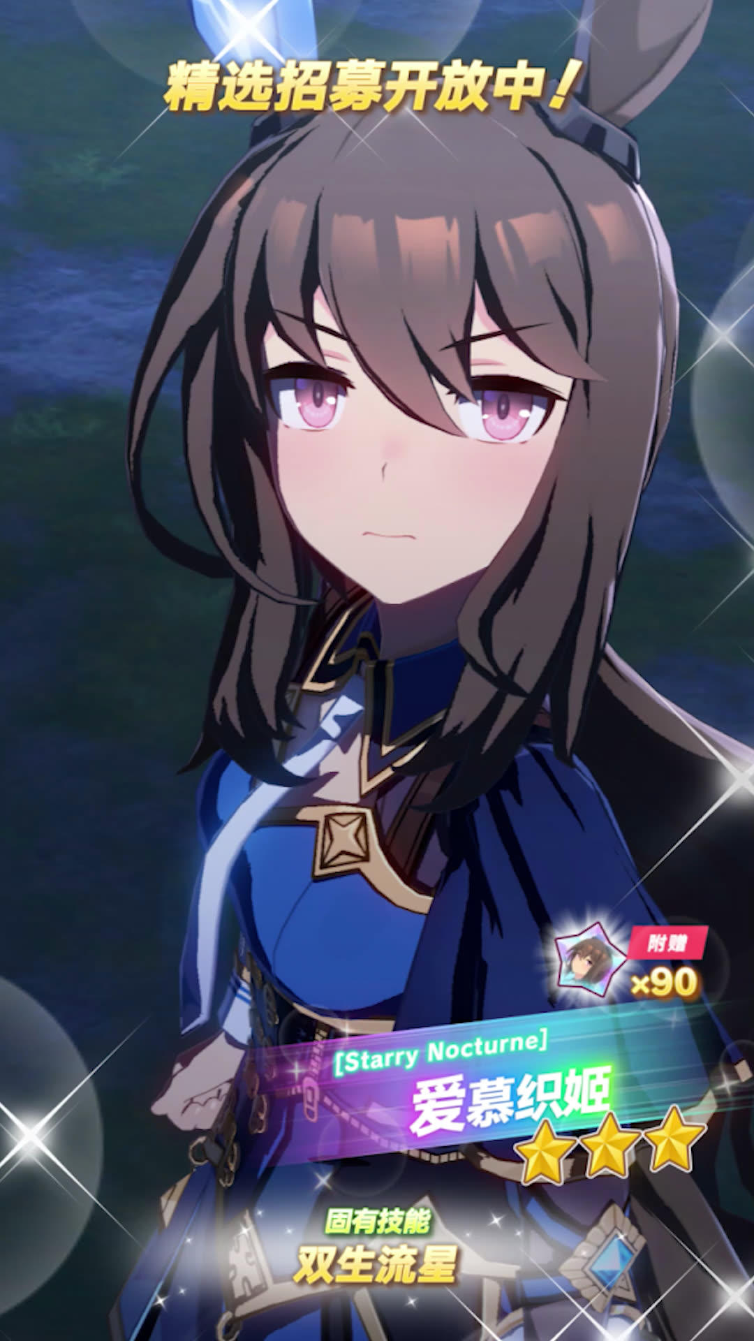新的★★★养成优俊少女[Starry Nocturne]爱慕织姬(配音:咲咲木瞳)登场! ✦[Starry Nocturne]爱慕织姬 能力介绍✦ 距离适应性:中距离 跑法适应性:后追 场地适应性:草地 固有技能:[双生流星] 8月28日 12:00起,游戏内已开放“精选 优俊少女招募”! 精选招募开放期间,抽取招募并获得上述养成优俊少女,将附赠“[Starry Nocturne]爱慕织姬的碎片”