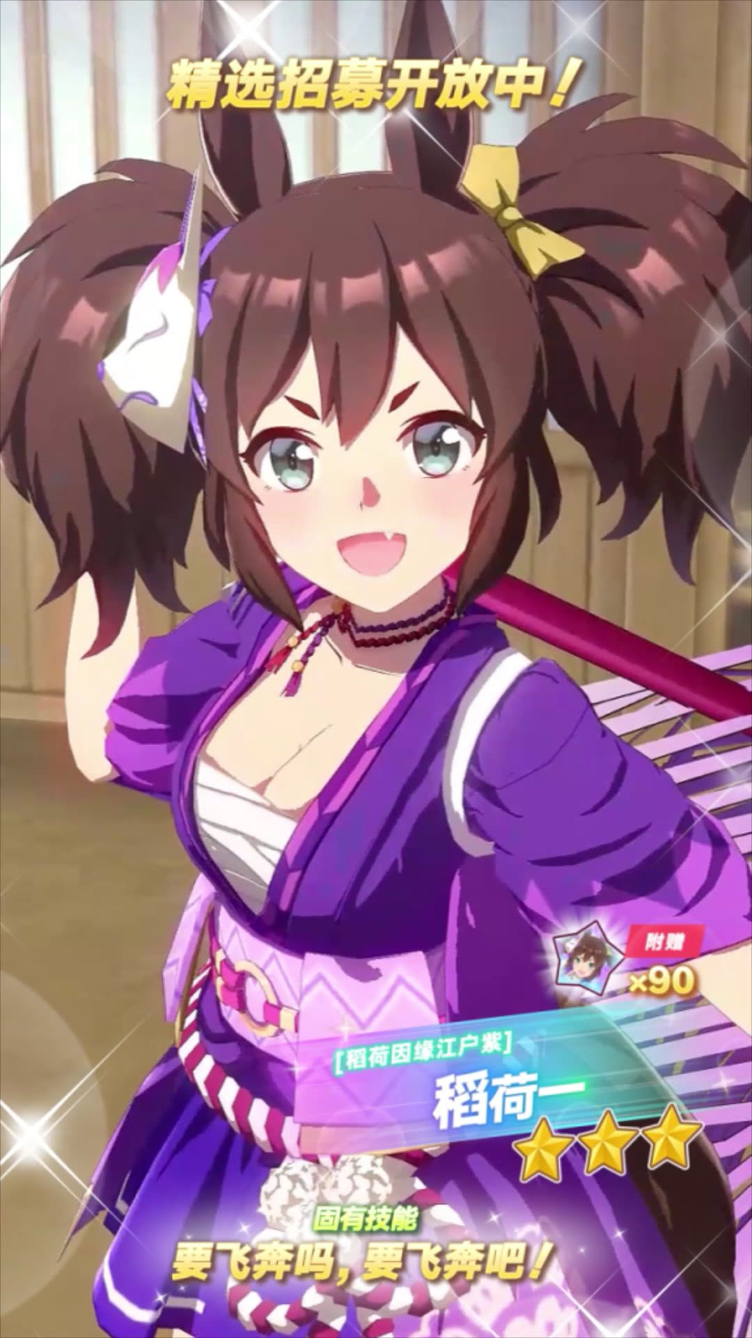 ✦[稻荷因缘江户紫]稻荷一 能力介绍✦ 距离适应性:中距离、长距离 跑法适应性:后追 场地适应性:草地、泥地 固有技能:[要飞奔吗,要飞奔吧!] 11月17日 12:00起,游戏内已开放“精选 优俊少女招募”! 精选招募开放期间,抽取招募并获得上述养成优俊少女,将附赠“[稻荷因缘江户紫]稻荷一的碎片”×90,还请不要错过! 今后也请多多支持《闪耀!优俊少女》!