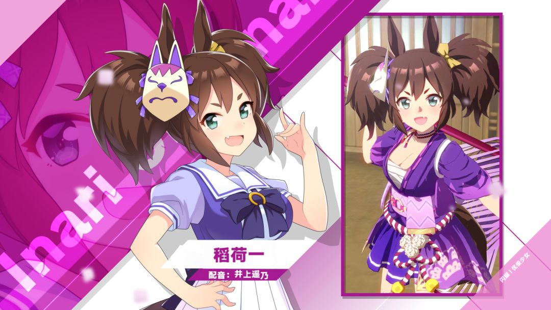 全国的新人训练员们,来认识一下那些在特雷森学园和我们一起实现梦想的学生吧! 个子小巧,性格调皮,最讨厌不公正的事情;豪爽率性的江户优俊少女“稻荷一”。虽然在盛大的比赛中总能展现潇洒的跑姿,但有时劲头太猛,反而在重要舞台上华丽地栽个大跟头。 配音:井上遥乃