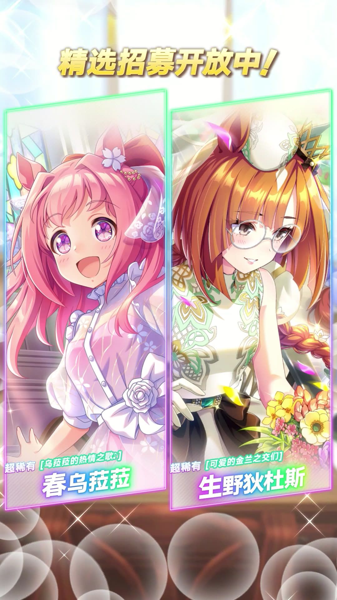 新的超稀有 [乌菈菈的热情之歌♪]春乌菈菈、[可爱的金兰之交们]生野狄杜斯 等协助卡登场! 本次招募中新登场的协助卡,在当前开放的剧情活动“‘限时’~Silks&Three Riddles~”中可获得加成! ■新登场的协助卡 超稀有 [乌菈菈的热情之歌♪]春乌菈菈(配音:首藤志奈) 超稀有 [可爱的金兰之交们]生野狄杜斯(配音:田泽茉纯) 11月7日 12:00起,游戏内已开放“精选 协助卡招募