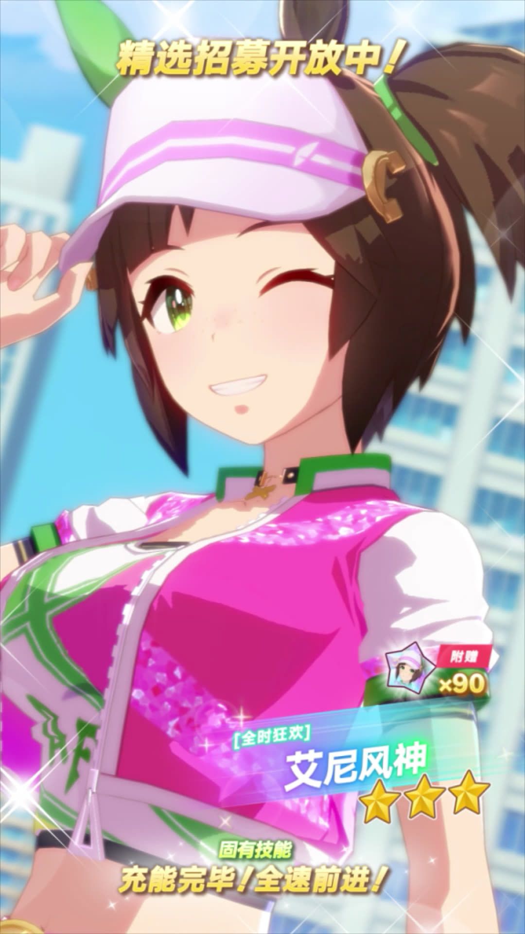 ✦[全时狂欢]艾尼风神 能力介绍✦ 距离适应性:英里、中距离 跑法适应性:领跑 场地适应性:草地 固有技能:[充能完毕!全速前进!] 10月30日 12:00起,游戏内已开放“精选 优俊少女招募”! 精选招募开放期间,抽取招募并获得上述养成优俊少女,将附赠“[全时狂欢]艾尼风神的碎片”×90,还请不要错过! 今后也请多多支持《闪耀!优俊少女》!