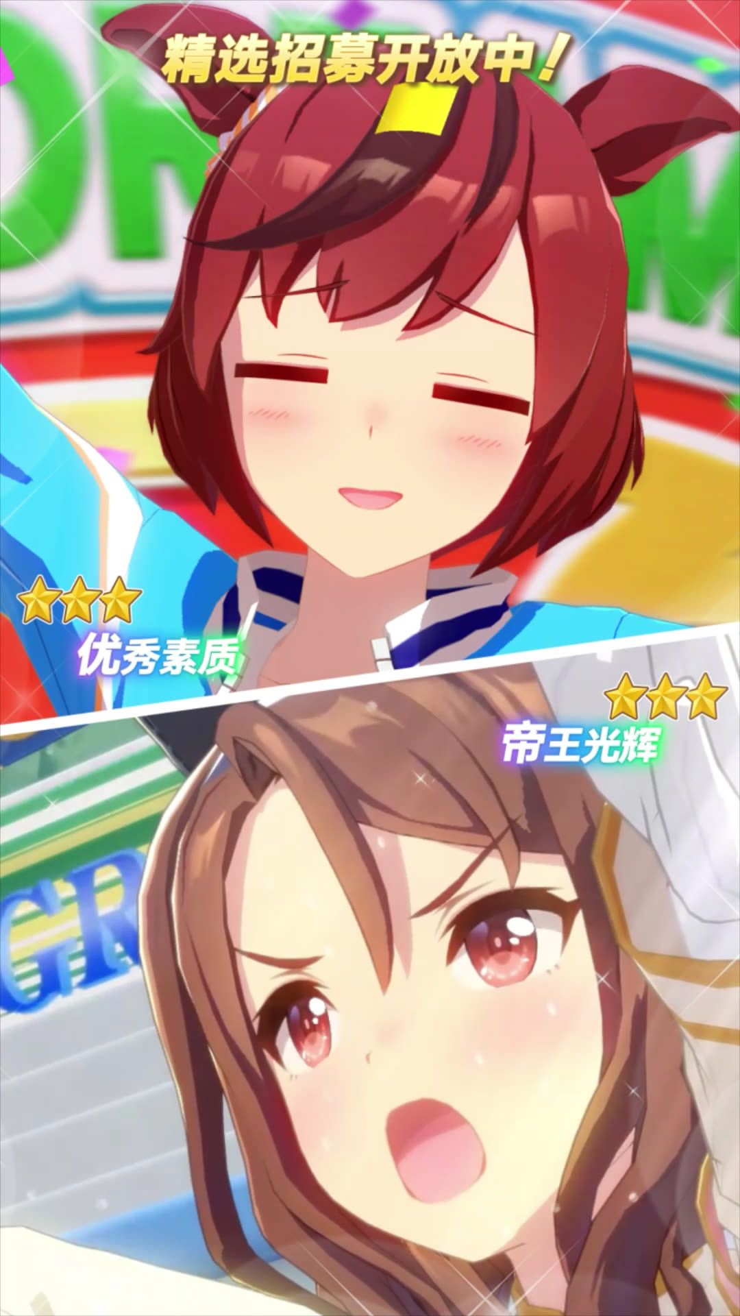 新的★★★养成优俊少女[RUN&WIN]优秀素质(配音:前田佳织里)& [洁白傲气的激励之服]帝王光辉(配音:佐伯伊织)登场! 本次招募中新登场的养成优俊少女,在当前开放的剧情活动“高声喝彩!特雷森学园后援团”中可获得加成! ✦[RUN&WIN]优秀素质 能力介绍✦ 距离适应性:中距离、长距离 跑法适应性:居中 场地适应性:草地 固有技能:[Go☆Go☆for it!] ✦[洁白傲气的激励之服]