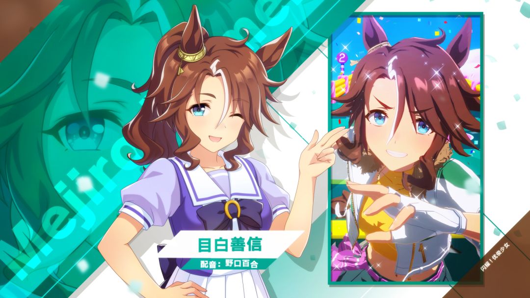 全国的新人训练员们,来认识一下那些在特雷森学园和我们一起实现梦想的学生吧! 虽是目白家的大小姐,但平易近人又能调动气氛的“目白善信”。曾烦恼于和优秀的亲戚们进行比较,但只要能保持乐观不断领跑,总有一天能开创出自己的道路。 配音:野口百合