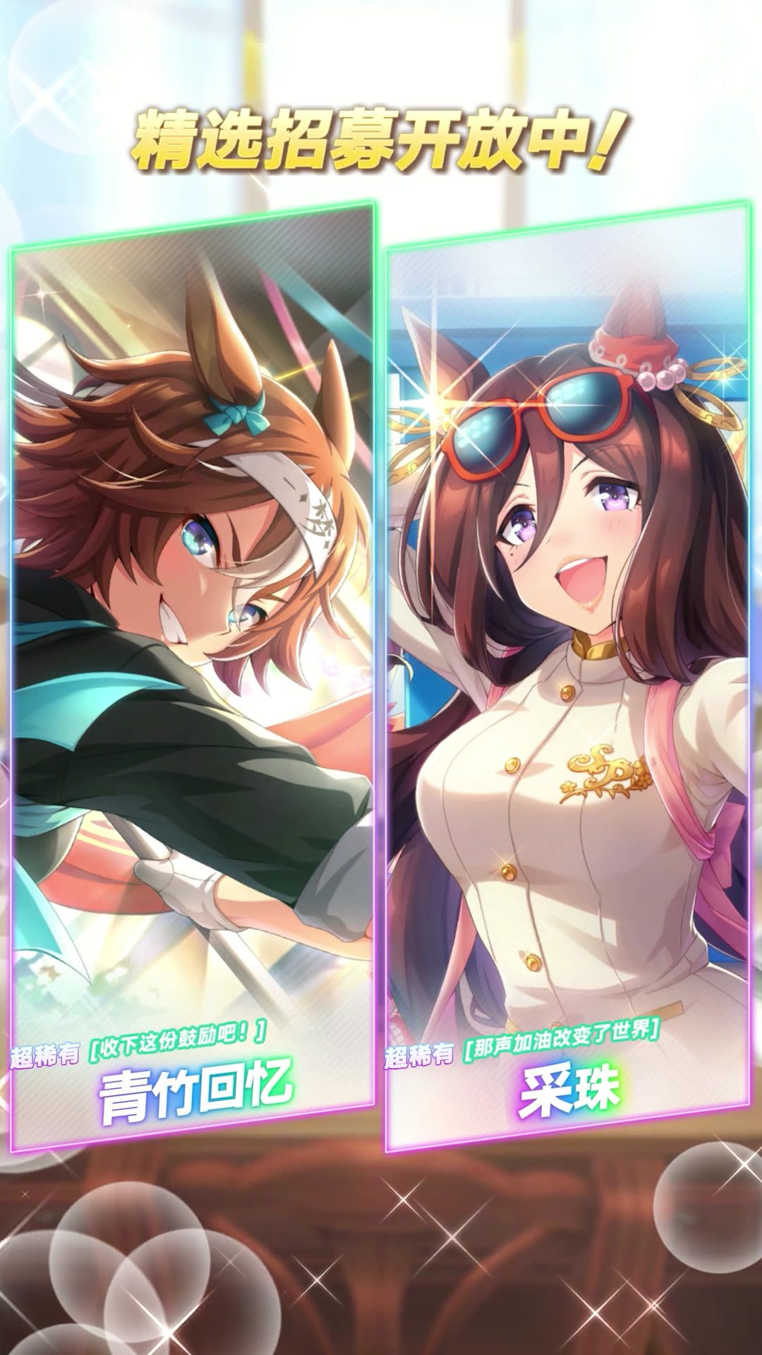 新的超稀有 [收下这份鼓励吧!]青竹回忆、[那声加油改变了世界]采珠 等协助卡登场! 本次招募中新登场的协助卡,在当前开放的剧情活动“高声喝彩!特雷森学园后援团”中可获得加成! ■新登场的协助卡 超稀有 [收下这份鼓励吧!]青竹回忆(配音:蓝原琴美) 超稀有 [那声加油改变了世界]采珠(配音:福原绫香) 10月20日 12:00起,游戏内已开放“精选 协助卡招募”,还请不要错过! 今后也请多多支