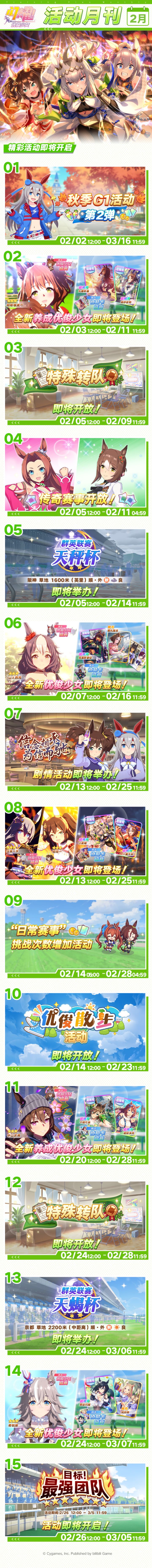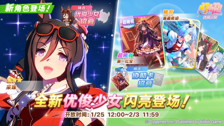 ■新登场的协助卡 超稀有 [啊,华丽一族]第一红宝(配音:矶部花凜) 稀有 [The 3rd MIRACLE]喜嘉奇迹(配音:佐藤日向) 普通 [特雷森学园]第一红宝(配音:矶部花凜) 普通 [特雷森学园]喜嘉奇迹(配音:佐藤日向) 1月25日 12:00起,游戏内已开放“精选 协助卡招募”,还请不要错过! 今后也请多多支持《闪耀!优俊少女》!