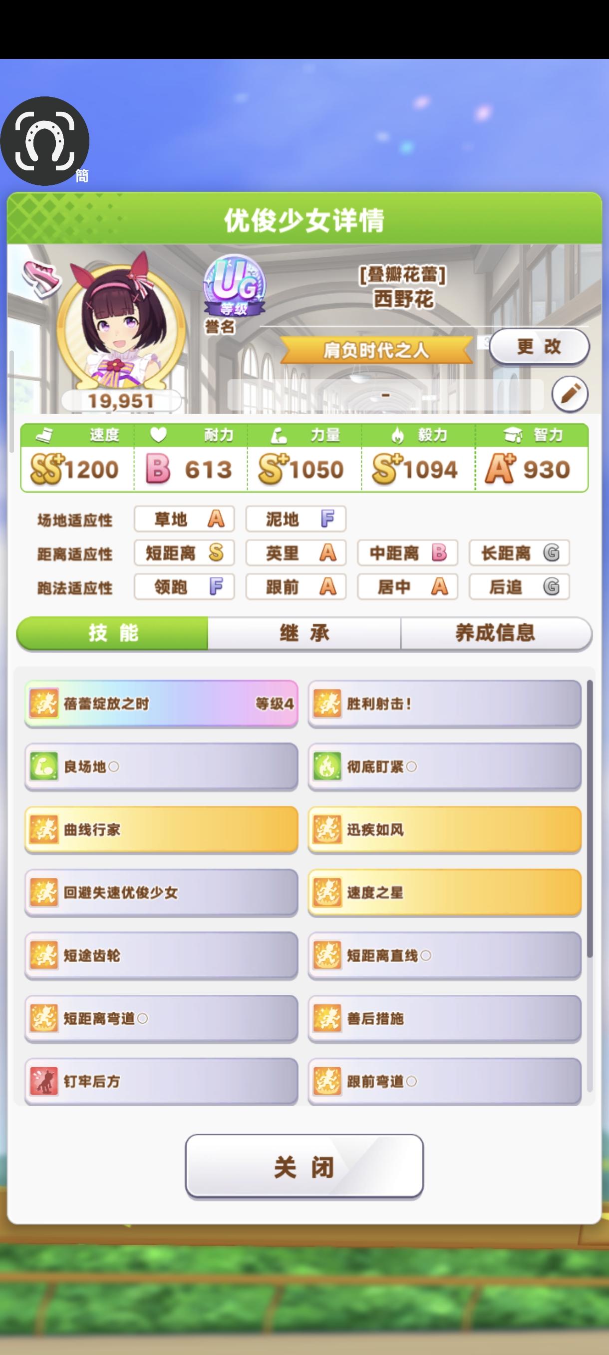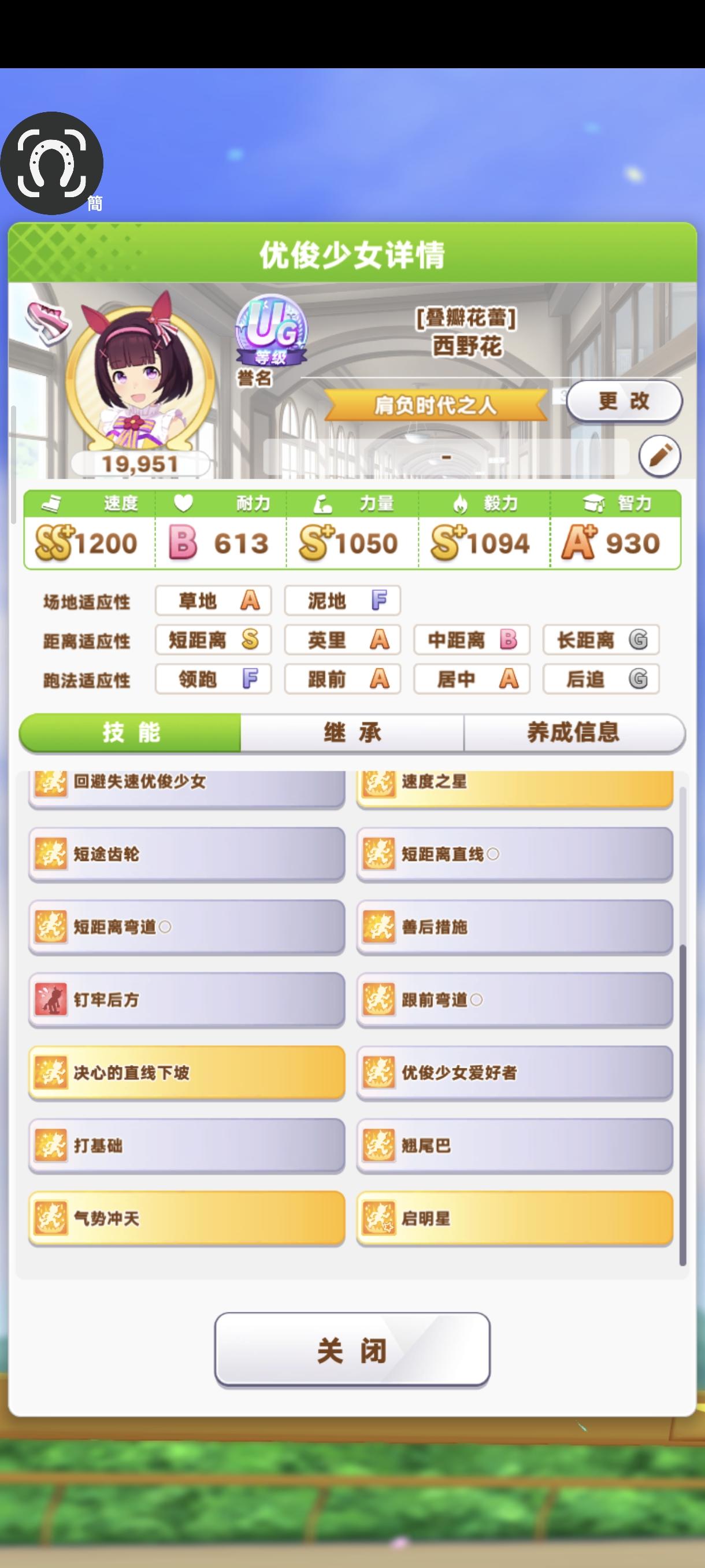 大佬能帮忙看下这个西野花怎么样,好不容易出了次切,这个属性虽然不是顶级,但是听说这期运气成分更大,更看技能,所以还是想看看这个西野花能上A决吗。其实这个速度没想到,一个速福来都能让速度超了50属性。早知道一些事件不选速度了