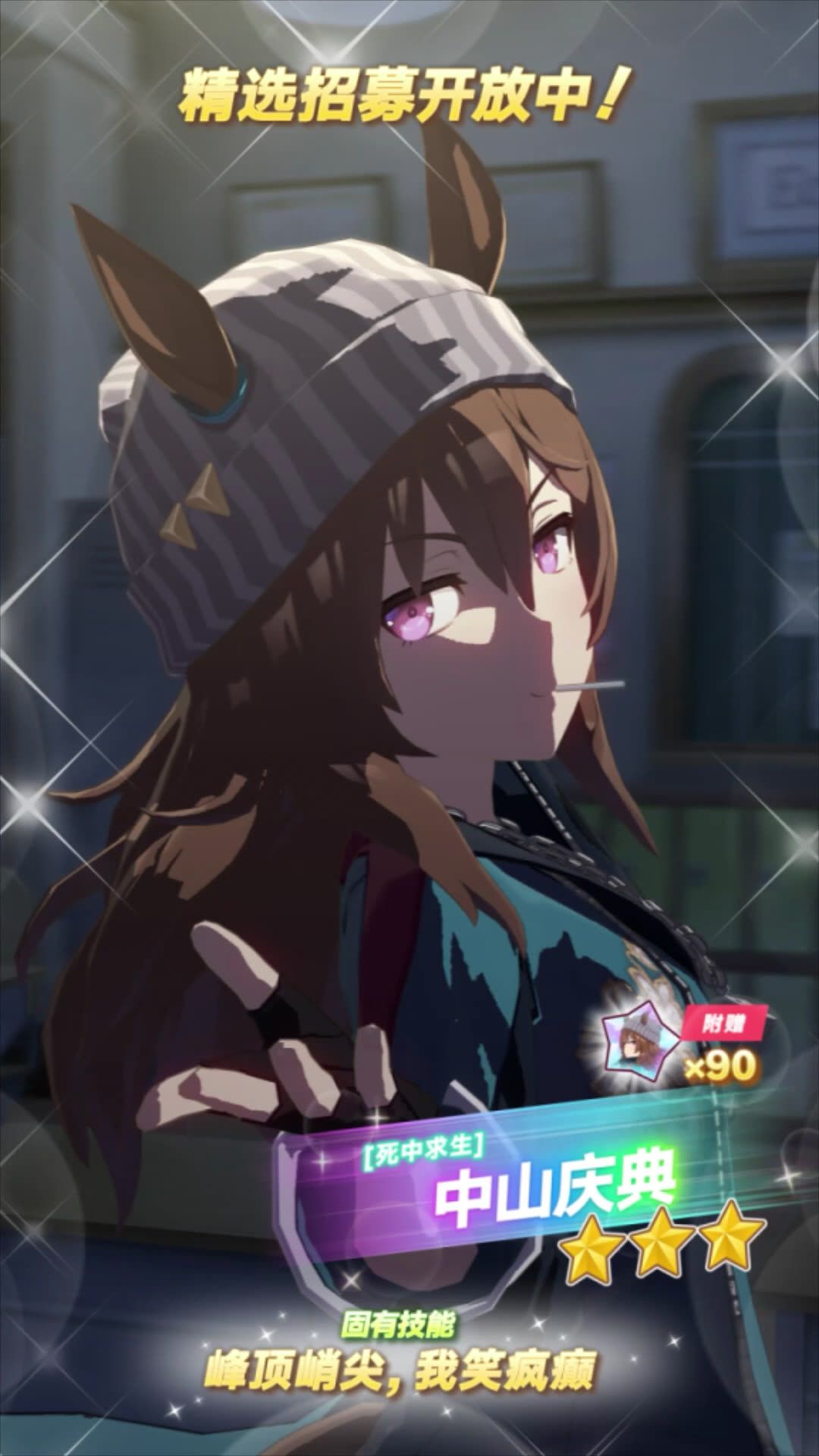 ✦[死中求生]中山庆典 能力介绍✦ 距离适应性:中距离 跑法适应性:跟前、居中 场地适应性:草地 固有技能:[峰顶峭尖,我笑疯癫] 2月20日 12:00起,游戏内已开放“精选 优俊少女招募”! 精选招募开放期间,抽取招募并获得上述养成优俊少女,将附赠“[死中求生]中山庆典的碎片”×90,还请不要错过! 今后也请多多支持《闪耀!优俊少女》!