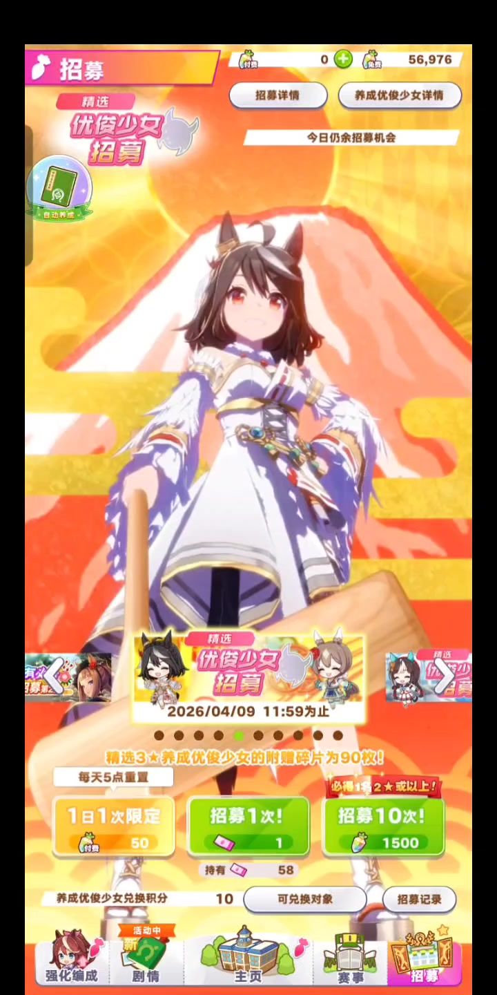 ■新登场的协助卡 超稀有 [To you]喜嘉奇迹(配音:佐藤日向) 稀有 [附件,要热一下吗?]阿斯顿真弓(配音:井上穗乃花) 普通 [特雷森学园]阿斯顿真弓(配音:井上穗乃花) 4月10日 12:00起,游戏内已开放“精选 协助卡招募”,还请不要错过! 今后也请多多支持《闪耀!优俊少女》!