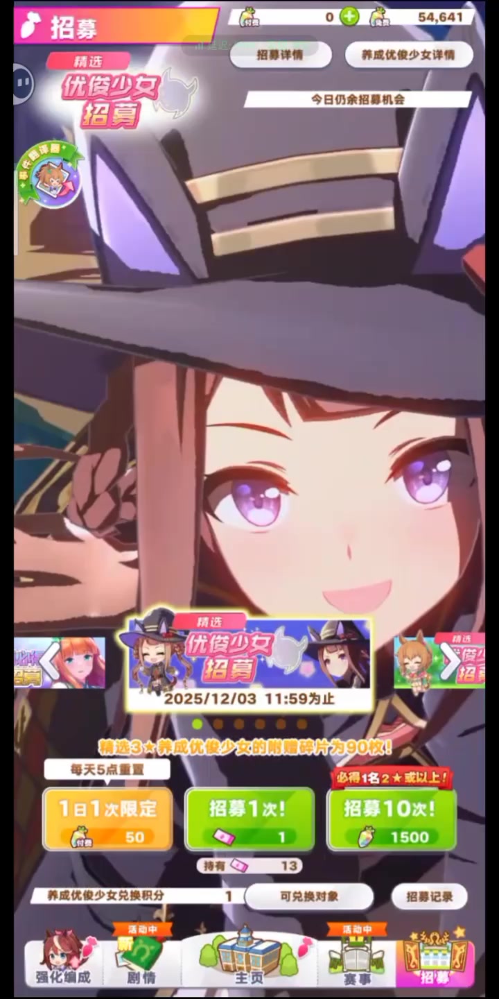 ✦[unsigned]空中神宫 能力介绍✦ 距离适应性:中距离、长距离 跑法适应性:居中、后追 场地适应性:草地 固有技能:[trigger:BEAT] 12月5日 12:00起,游戏内已开放“精选 优俊少女招募”! 精选招募开放期间,抽取招募并获得上述养成优俊少女,将附赠“[unsigned]空中神宫的碎片”×90,还请不要错过! 今后也请多多支持《闪耀!优俊少女》!