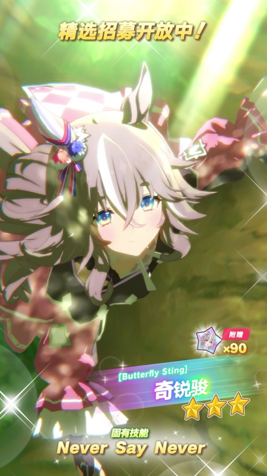 ✦[Butterfly Sting]奇锐骏 能力介绍✦ 距离适应性:英里、中距离 跑法适应性:跟前 场地适应性:泥地 固有技能:[Never Say Never] 2月24日 12:00起,游戏内已开放“精选 优俊少女招募”! 精选招募开放期间,抽取招募并获得上述养成优俊少女,将附赠“[Butterfly Sting]奇锐骏的碎片”×90,还请不要错过! 今后也请多多支持《闪耀!优俊少女》!