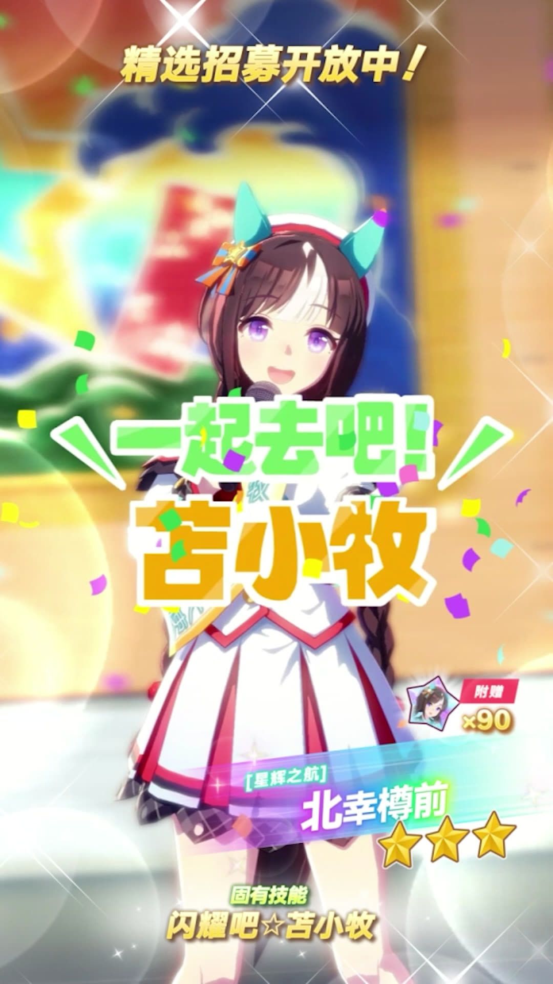 ✦[星辉之航]北幸樽前 能力介绍✦ 距离适应性:英里、中距离 跑法适应性:跟前 场地适应性:泥地 固有技能:[闪耀吧☆苫小牧] 4月1日 12:00起,游戏内已开放“精选 优俊少女招募”! 精选招募开放期间,抽取招募并获得上述养成优俊少女,将附赠“[星辉之航]北幸樽前的碎片”×90,还请不要错过! 今后也请多多支持《闪耀!优俊少女》!