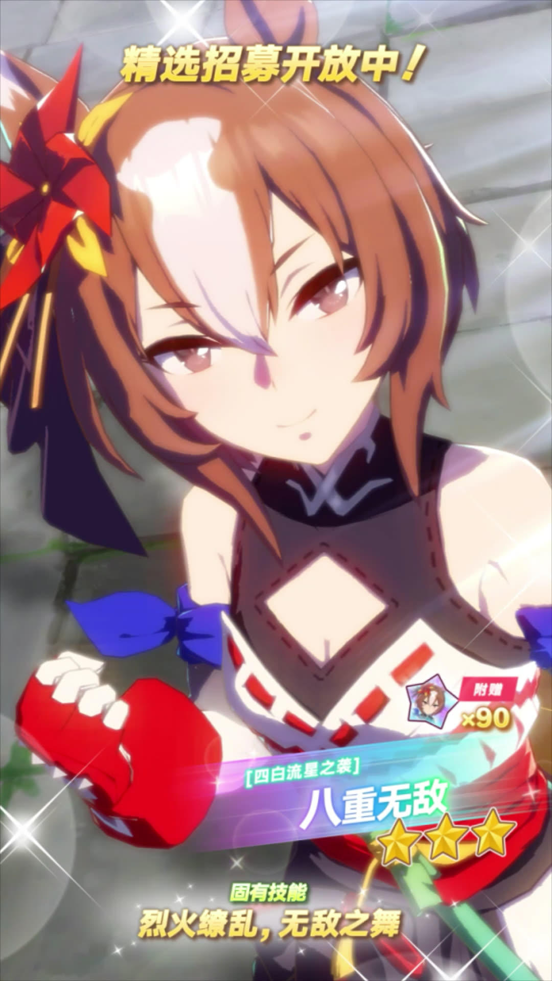 ✦[四白流星之袭]八重无敌 能力介绍✦ 距离适应性:中距离 跑法适应性:跟前、居中 场地适应性:草地 固有技能:[烈火缭乱,无敌之舞] 10月13日 12:00起,游戏内已开放“精选 优俊少女招募”! 精选招募开放期间,抽取招募并获得上述养成优俊少女,将附赠相应的养成优俊少女碎片,还请不要错过! 今后也请多多支持《闪耀!优俊少女》!