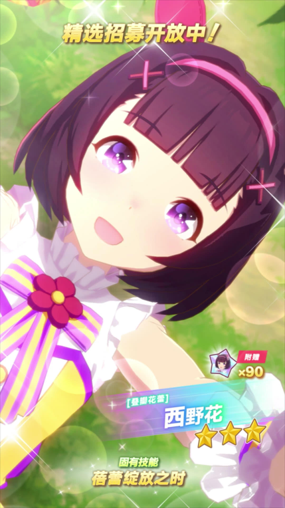 ✦[叠瓣花蕾]西野花 能力介绍✦ 距离适应性:短距离、英里 跑法适应性:跟前、居中 场地适应性:草地 固有技能:[蓓蕾绽放之时] 10月6日 12:00起,游戏内已开放“精选 养成优俊少女招募”! 精选招募开放期间,抽取招募并获得上述养成优俊少女,将附赠“[叠瓣花蕾]西野花的碎片”×90,还请不要错过! 今后也请多多支持《闪耀!优俊少女》!