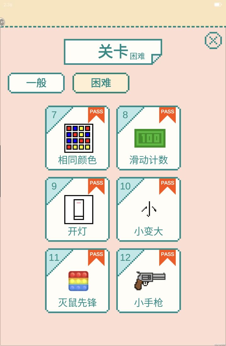 我是一个音游玩家,手速比普通人快一点,但只能勉强全通关。画面没什么可说的,挺普通的。但是有些关卡难度过于难了,比如钟表、数字竞速、小变大这三个关卡,这三关即便是一般难度,难度也极高!先说钟表,这一关屏幕中有一个钟表,涵盖一个分针和时针,玩家需要转动分针使钟表转圈,这么一听挺简单的吧?但是这个一圈是指时针转一圈,一般难度只需要转八圈,但是困难难度直接翻倍,这也是这个游戏中最难的一个关卡了,因为没有办法用连点器解,只能纯手转。其次难度是数字竞速,在屏幕上方会出现数字,玩家需要点下方键盘上的对应数字,这都相当于一个10k音游了!这一关一般难度是60次,困难难度是90次。最后再说一下小变大这个关卡(注意是小变大,不是大变小,小变大难度是大变小的两倍,也有可能是因为我用平板玩的原因),这一关中屏幕中央有一个“小”字,玩家需要用两根手指向外拉,使小字变大,当变到最大时,则会记一次分,一般难度是18次,困难难度是22次,这关即便是一般难度也极难,同样也没法用连点器解,难点主要是小字并不是一次就能拉大,而是要拉很多次。