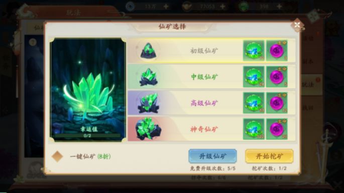 仙矿玩法是游戏中获取元宝的重要途径之一,角色85级开启【仙矿采集】,每天有2次免费挖矿次数,次数不足无法挖矿,每天05点重置挖矿次数,记得在5点前完成挖矿哦~通过【升级仙矿】可以提升采集仙矿的品质,获得更大收益。每天有3次免费升级次数,提升vip可以获得更多免费升级次数,采集仙矿的品质越高,元宝和兽魂材料的收益越高,免费次数不足,则可以通过消耗元宝继续提升,每次提升有几率提升成功,提升失败则获得