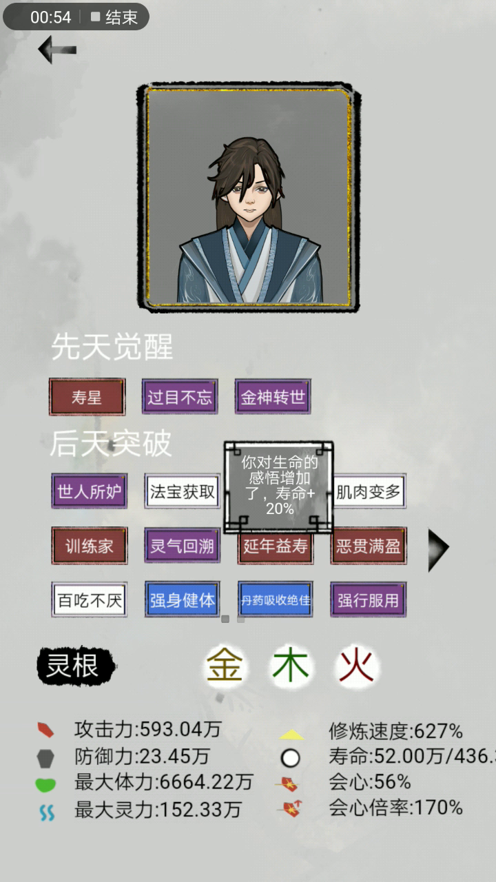 什么天赋无所谓,想玩什么流派自己搭配就行了。 话不多说,来正题。 几个基础知识: 1,丹药可以传承3种,数量有多少传承多少。 2,通关最大的难题就是寿命的问题,其实寿命解决了,其他都不是问题,所以解决寿命问题就是玩这个游戏的真谛。 3,每次境界提升的寿命等于基础寿命*系数,例如基础寿命为A,到渡劫时系数为x,那么实际寿命=A*x,这个x没有去研究具体是多少。开局时的寿命就是基础寿命,等于80 4,