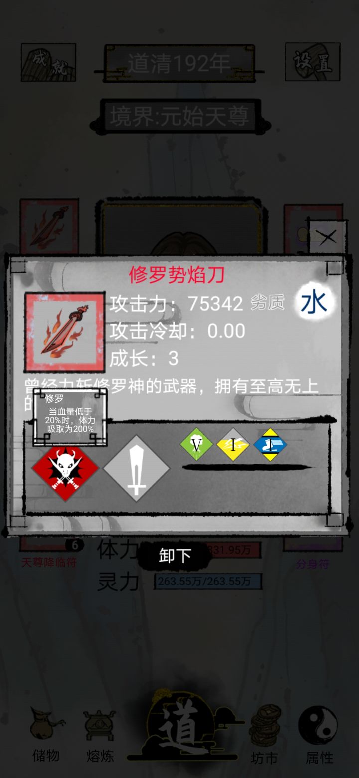 废了好大力气,终于打出了五灵根攻击力1的至尊,刚才不小心吃了个丹药变成2了,不过不重要,重要的是菩萨心肠