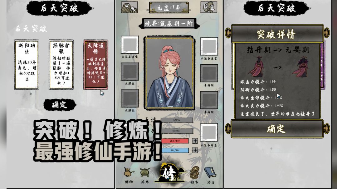 游戏主页:https://www.taptap.com/app/212199 一款竖屏单机修仙游戏,建议开局。灵根越少修炼速度越快,在保证自己有木头人的情况下,可以考虑多刷新几次,保证灵根较少,金火灵根最佳,通过木头人保留修为,第2轮再去再提高,游戏可塑性很强,随机事件跟你产生不一样的效果体验!快来一起的和老怪咖来看一看吧!