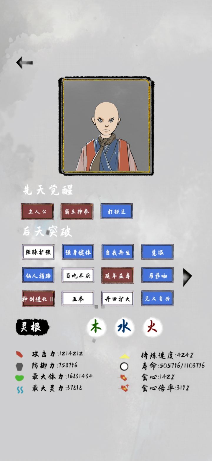 这游戏充满了随机性,玩法多样性,多种搭配!废话不多说!正题开局天赋天赋这东西不一定要强求,后期也有随机天赋,这里多注意这几个天赋属性转世,寿星,木头人,主人公属性转世:可以保证法宝来源稳定寿星:可以增加寿命和属性!详情:小阶段突破:攻防血蓝增加10%大阶段突破:攻防血蓝增加80%,寿命增加150%散仙小阶段突破:攻防血蓝增加25%,寿命增加8%散仙大阶段突破:攻防血蓝增加80