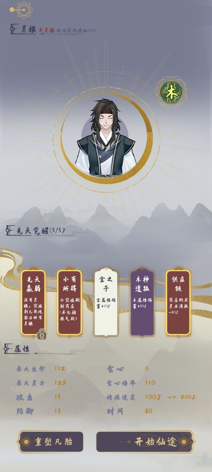 开局可以选红色商人天赋(商店道具-50%)之后刷商店把所以东西都买了再卖出去除了用得到的还有加修炼速度的包祸体力之后东西都卖了符可以只保留金龙附体不要卖最后升至尊要用到准备多一点打不过妖怪也可以用还有功法三本木属性菩提之心紫色的升到满级每秒有百分之十五回血