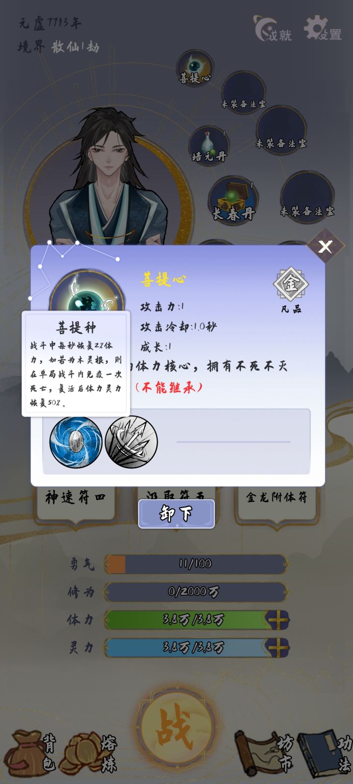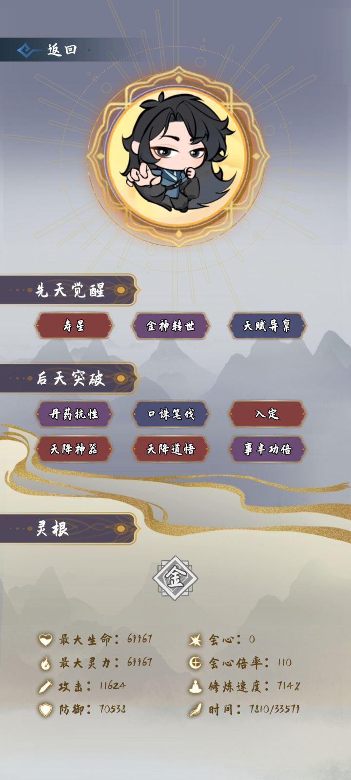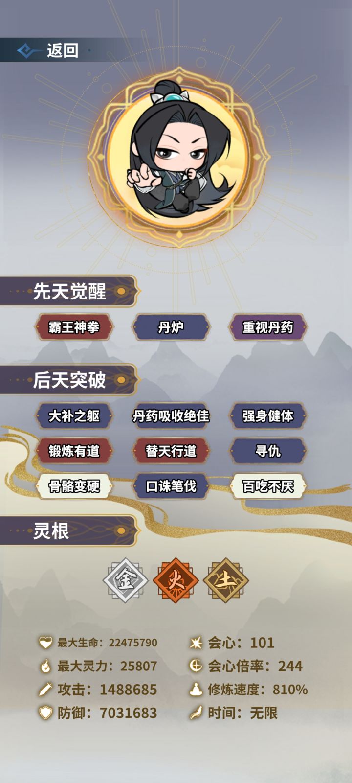 没有玩明白想找找思路的可以看这篇贴是萌新可以稳健上至尊的路径之一之一之一①开局。此时应该已经玩了一两局了,局内右上角点成就,需要完成坊市倒卖多少次,以及选天赋的时候达到刚出生就体力/攻击/防御初始+100%。这样才可以解锁刷钱天赋和加属性丹药。把不难达成的还有至少把加攻击的做掉,垃圾法宝和垃圾天赋的考虑别做,会影响掉落和刷新。本帖推荐三刷钱天赋开局,灵根尽量为三个或四个,若你已解锁寿命属性丹