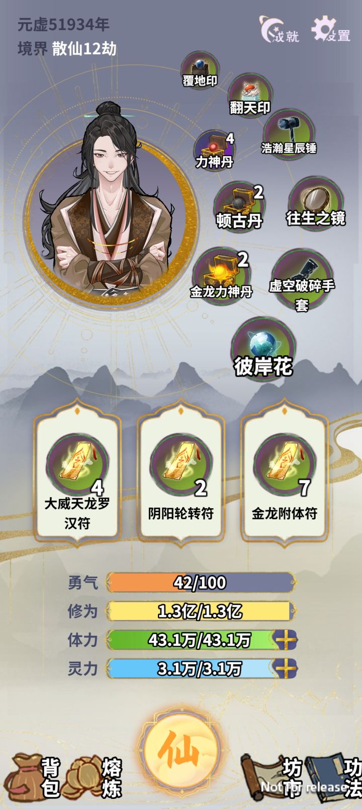 (2.18)问道302层镇楼,多难懂得都懂。应该是版本最高层数了159层作古,302层还在继续尝试打下去,不过很难了,一破就碎上古版本第一个发丹体丹炉丹修的我又回来了,这次依旧是丹道至上。1.丹体+丹炉的丹道,第三个随意,灵根越多越好; 2.随便几局,刷东西卖灵石,继承灵石,存100万灵石开始; (灵石准备是给遇着忽然脸黑的买东西用)3.先天就是丹体+丹炉的丹修,第三随意;
