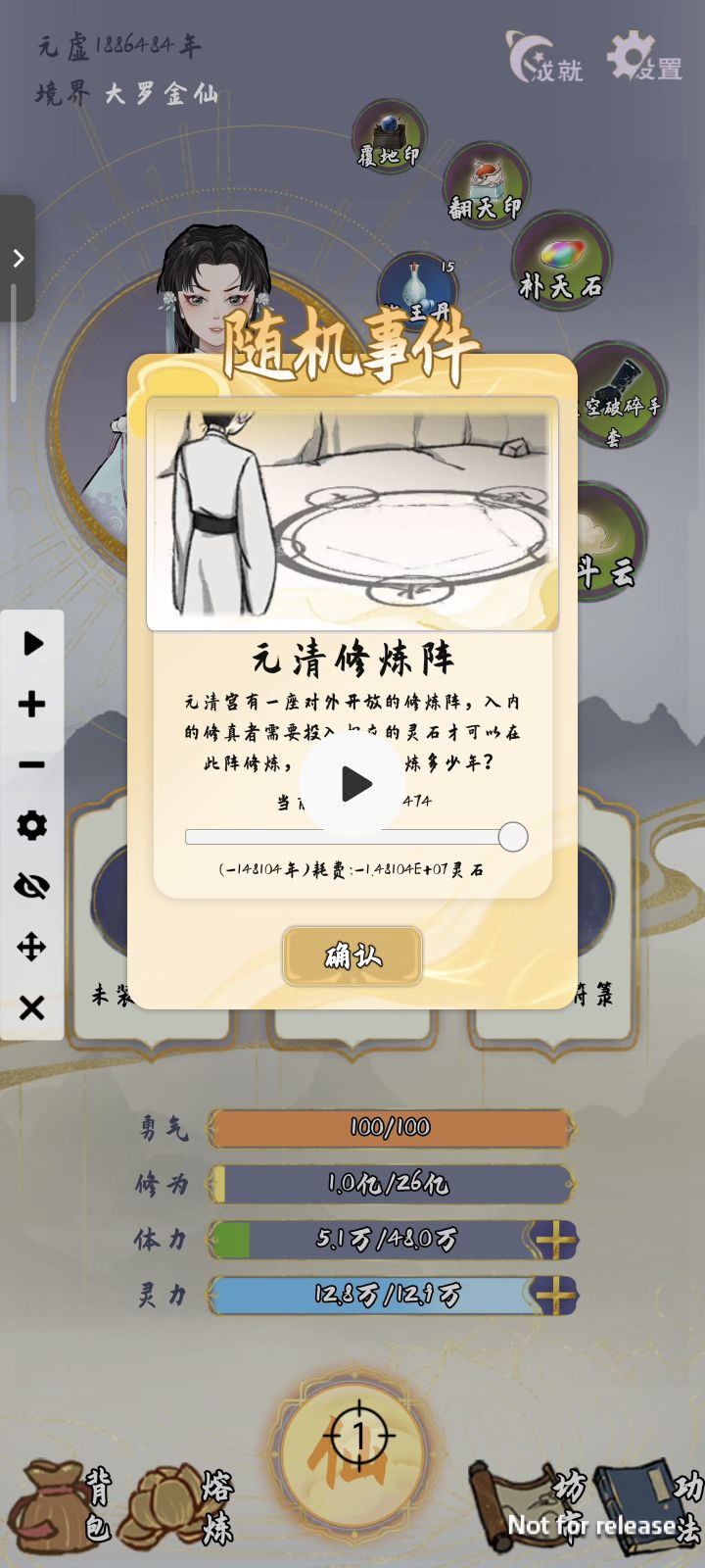使用那个随机变换属性的丹药复活之后,时间就超过去了,现在没办法继续点“战”,但其他的功能都可以点开,也不结束游戏