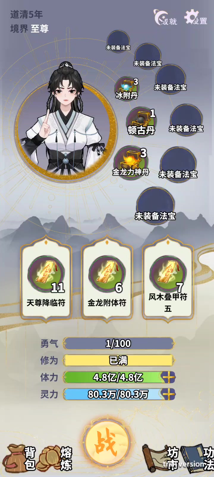 *此版本玩得最舒适只有嗑药流,即传承灵石用老板熟人刷加属性丹药,或多战斗吃怪掉的丹药,追求属性更高可开局选丹炉和丹药圣体还是啥,一红一紫两个加耐药性丹药效果的天赋,再带一个天命之子天赋。*先天天赋中的天命之子可以刷新一次后天天赋,不满意就退出重进,可以一直刷到你想要的。推荐渡劫期雷劫主动被打敗进入散仙,可以觉醒更多个后天天赋,推荐刷加耐药性的(加基础属性)、加属性百分比的(堆数值战斗爽)和遇敌人
