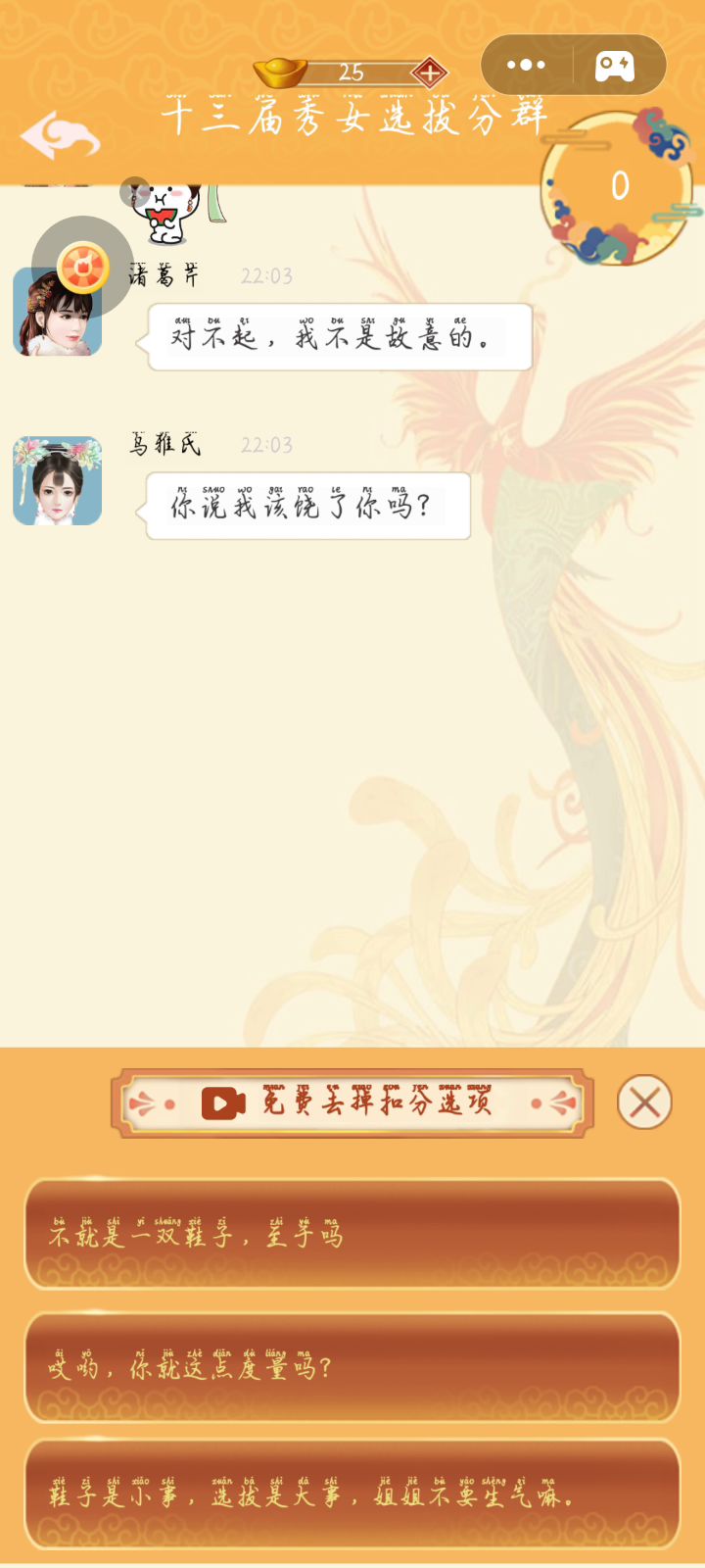 两天断断续续就玩玩了!说白了就是结合了甄嬛传中的嫔妃名字。延禧攻略中的故事,典型的就是珍珠粉事件,主角和侍卫有染的事,贵人生了个孩子被别人污蔑孩子是黄潼的事,反正很多都是延禧攻略里面的影子。虽然是对话式的游戏,但是人物都不是秒回的,里面的角色都会等个十几秒才会回复你。这游戏打发打发时间还好,要是一直玩那就无聊死了,看广告的地方也很多,嘿我偏不看哈哈哈哈哈哈哈,反正有的是时间耗。还有就是里面有建设宫殿的玩法,但这玩意前期还好,后期全部都是看广告才有钱,还不是直接给钱!你看个广告还要转转盘,转到钱才有钱,没转到就会转到什么摆设的物品,等于就是白转了!!!!最后就是,这个游戏前提是女主穿越之前的男朋友出轨了闺蜜,穿越后男朋友和出轨对象变成了皇帝皇后,穿越后为了报仇才入宫选秀的,但在宫里却是百般受皇帝的宠爱,和皇后关系也是好的不要不要的,知道后来皇后逝世,女主也没有做出什么类似报复之类的事情,反正就是完全没有逻辑,咱也不知道玩的到底是个啥