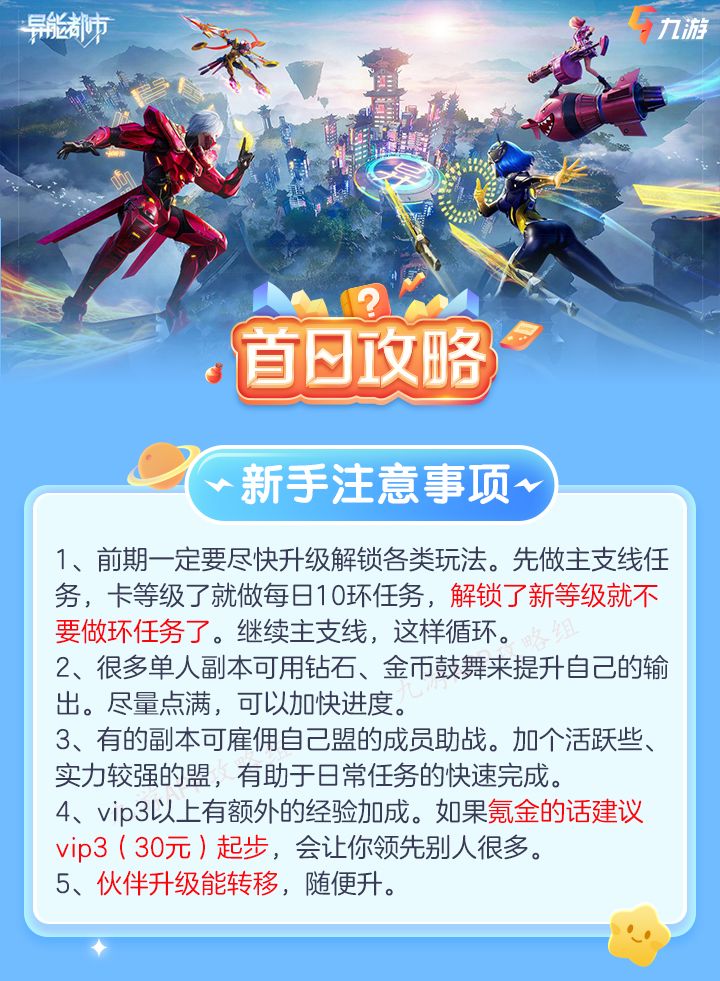 新手开局攻略: P1:新手注意事项 P2:职业选择 P3:前期快速升级 P4:伙伴选择 P5:装备培养 P6:礼包性价比 P7:氪金推荐 (本文由九游攻略组原创,转职请注明出处)