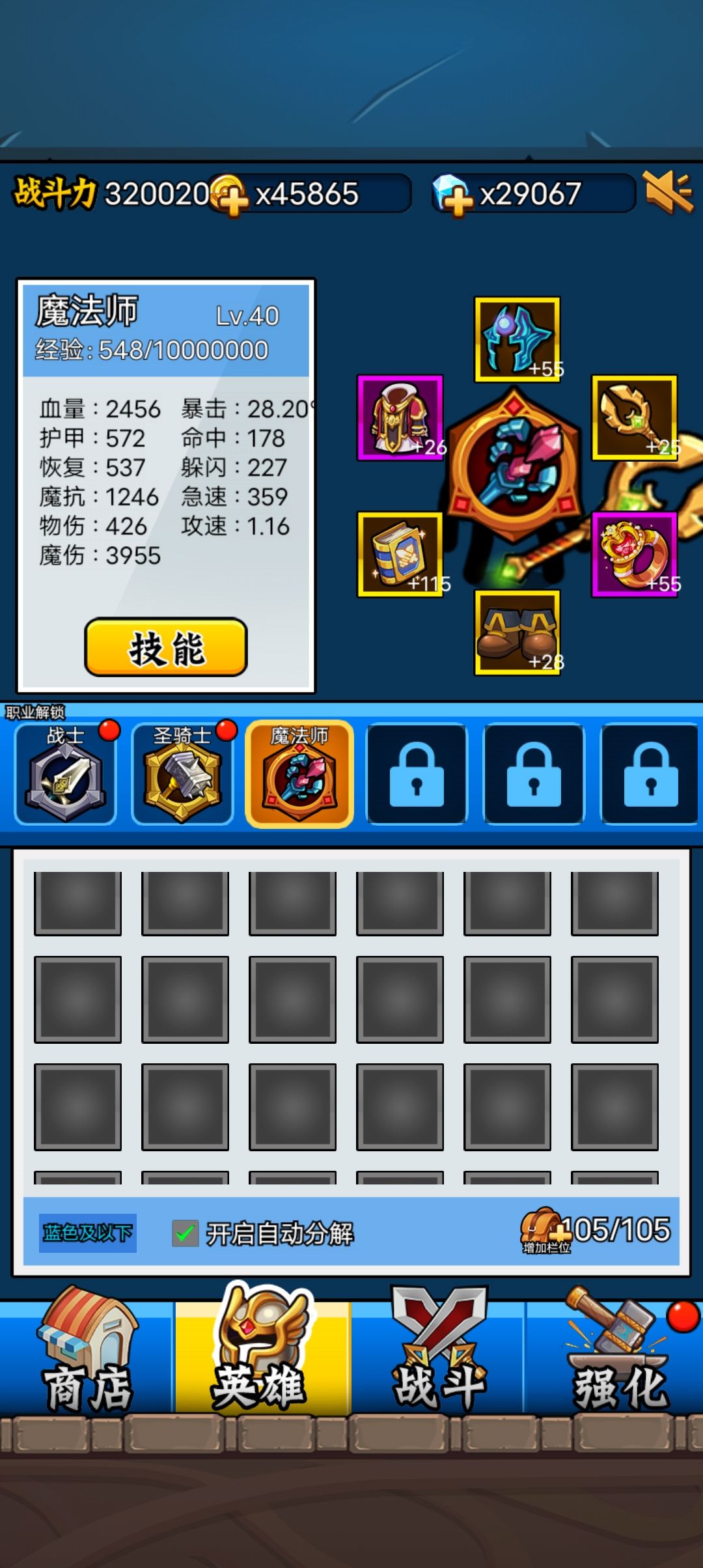 级别:40级满级,大概肝24小时,27级以后升级明显变慢,战力在10多万时候推图阻力最大,20万以后变轻松,但是战力涨得很慢。 地图:进地图需要战力要求,所以推图过程中,高战力装备一定留着,即便是垃圾,这样可以加速推图。大多数都停在boss房刷经验,因为boss房会产出武器。地图都有详情,自己仔细看一下产出比较好。 金币:提升装备位强化,但是提升不多,不用太刻意去看广告。 钻石:前期可以买来激活职