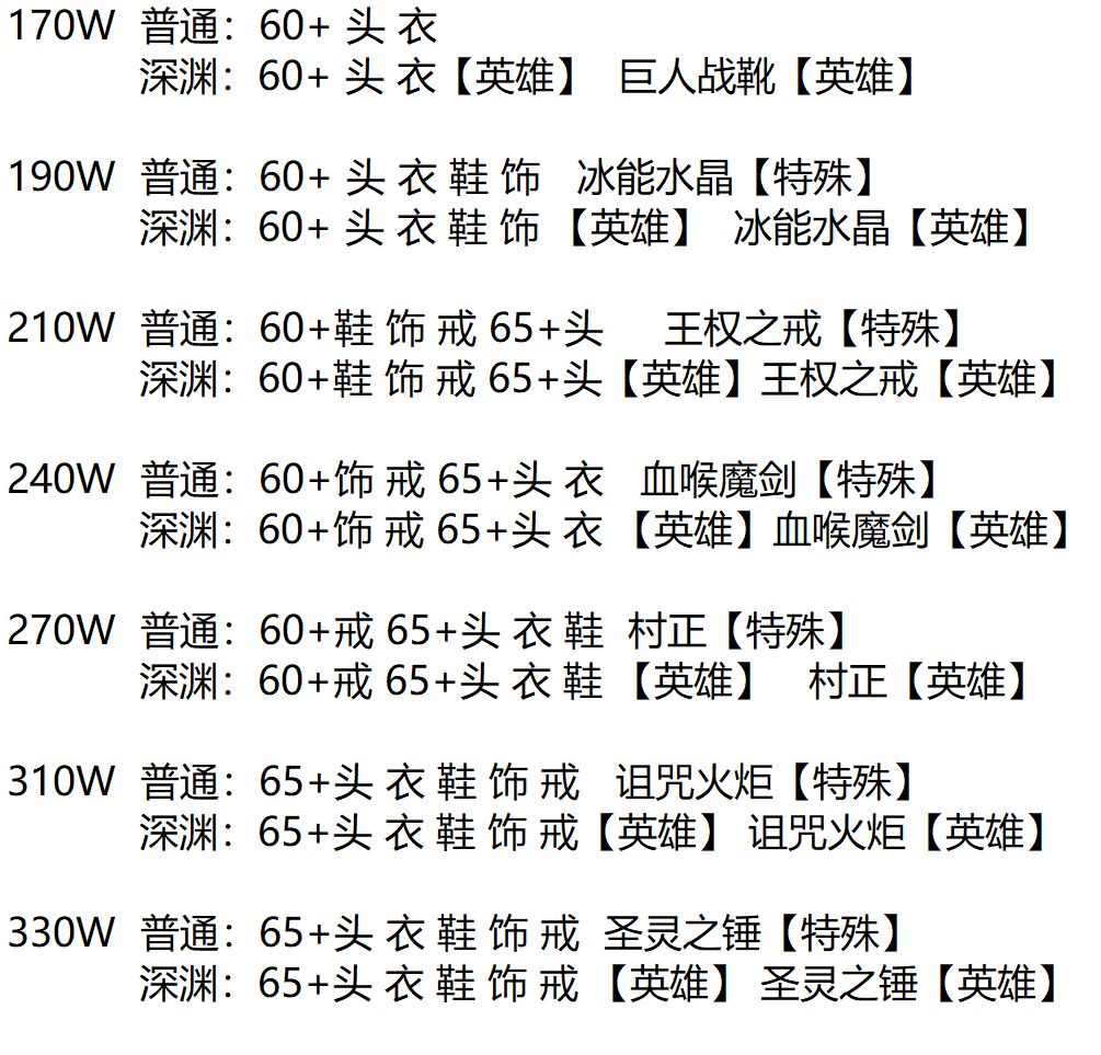 萌新攻略 萌新的圣骑士在50级以前一定得带着圣光套装,治疗全体在没有牧师的情况下非常好用。 圣骑士优先急速属性,四个30级圣光套装备加两个40级散件全部选急速属性,可以到1400左右,满冷却1500。 战士和法师,不追求任何套装,40级之后能带就带,属性越高越好,400+命中在50级以前就够用了,然后优先500暴击,暴击性价比高于急速,在命中和暴击足够的情况下再洗急速。 40以后的装备可以洗绿色词条 这个攻略只用于50级以前,肝帝请无视。 50级以后给战士攒一套金色50级装备,百分比词条90%以上的,战士装备可以用钻石去买因为可以用到60级,其他的随缘打怪掉。 所有职业绿色词条最低要求,暴击500,命中1500,急速1500,这是最低要求。 战士,法师,牧师优先命中和暴击;骑士优先急速和命中。 等57级之后可以带红色装备了,100wboss旁边有隐藏boss,街区点一下右边还有一个boss,里面暴60级武器,效果很不错。 60级之后,带上60级红装去170wboss上面的图挂机,晚上睡觉之前挂着就行,这个图暴所有带抗性的装备。 170wboss之后需要大量抗性,50级装备不够用。 突然发现170w,190w,240w都能慢慢刮死,战士切换成坦克就行。210w用战士或者法师清小弟就行,330w法师下装备送死就可以过。