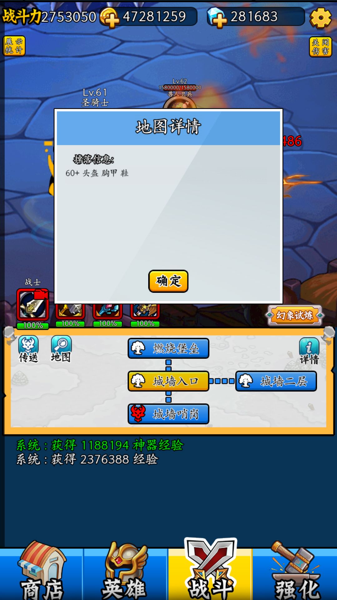昨天下午刚刚更新了新版本,战力33万boss40级刚刚到33万战力进去5000血战士,进去800万血boss几下这3个想太美就拉倒在地了,这时就我果断去39地图怪挂机大概2小时到了41级 到了41级就在图书馆boss门口地图挂机刷蓝色头盔,有钻石可以在商店买会随机刷新紫色,传说也不难!头盔准备好了3个,现在基本可以开打33万,36万boss了 头盔带上战力最低2万3一个就够了,套装头盔该换就换这样