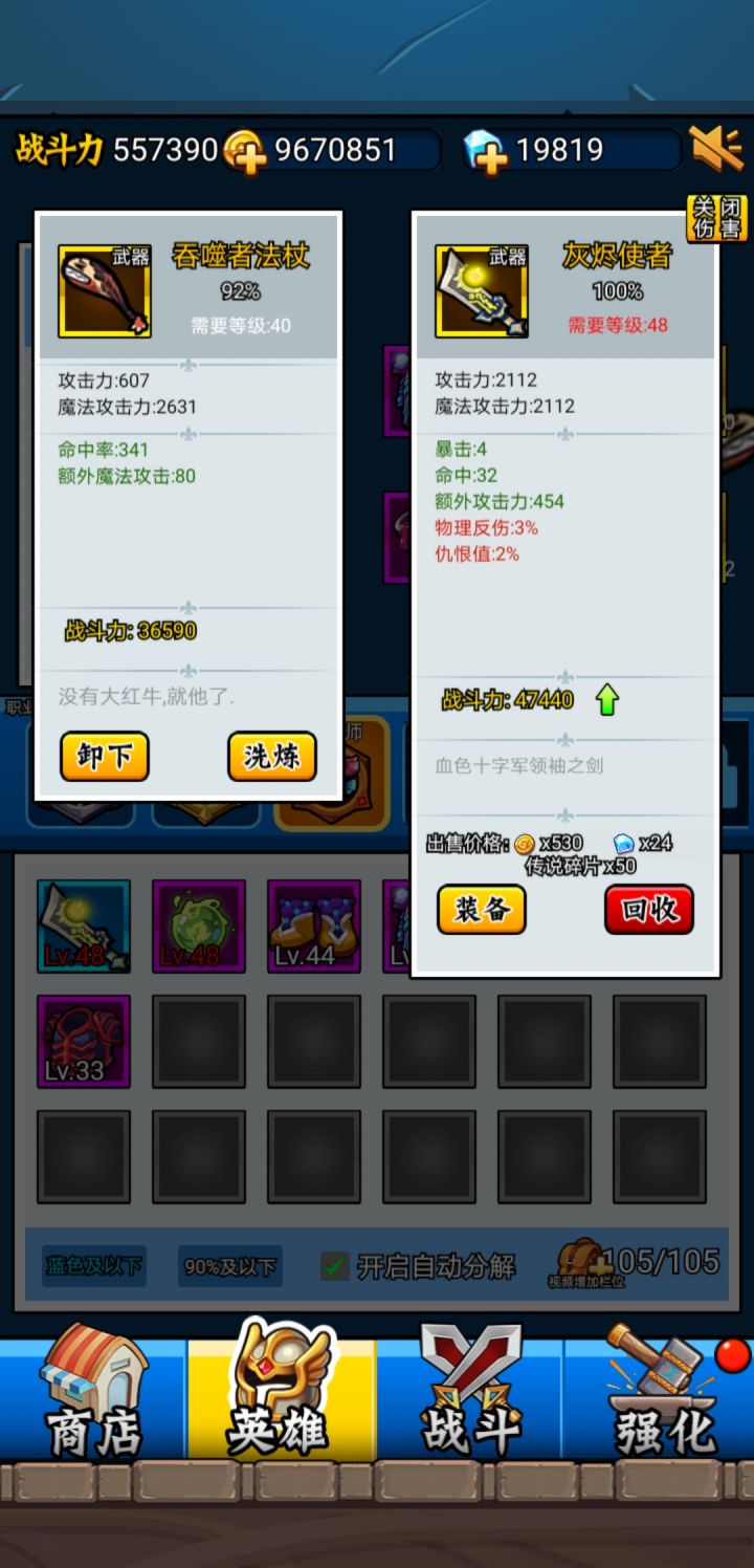 如下图,如果是金色衣服那我防御能力和攻击也会强些,但是紫色那件暴击多了这么多,换掉从87%暴击掉到62%很不爽啊,是你们的话怎么选择?